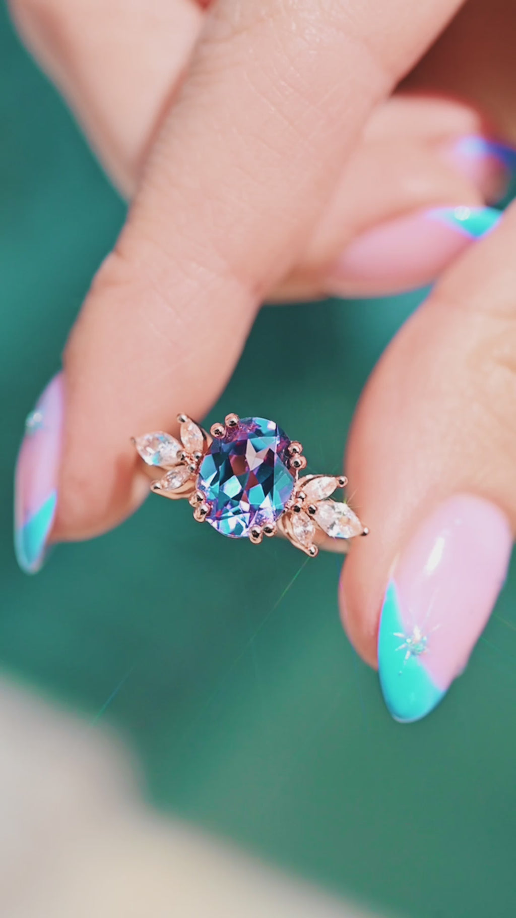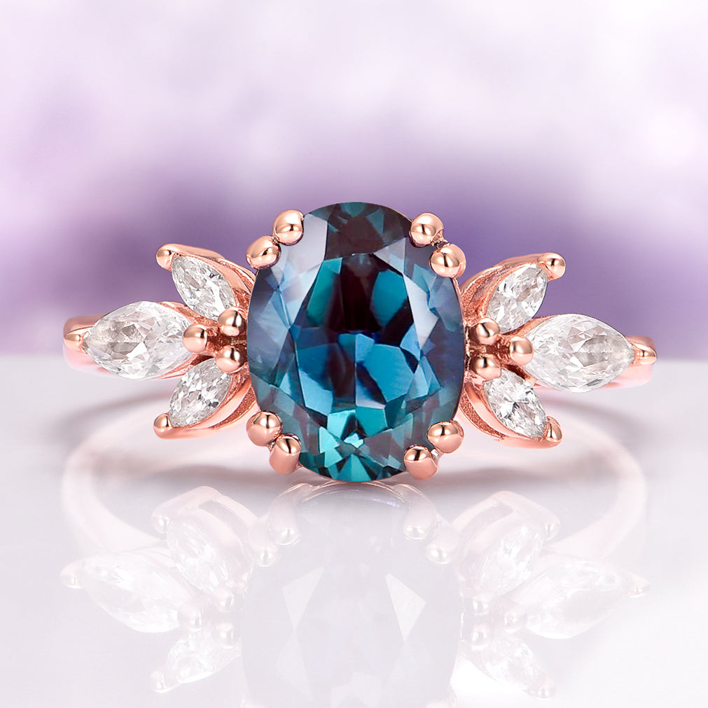Celebrate your love with the enchanting Oval Alexandrite Engagement Ring in 14K Rose Gold Vermeil, a unique lotus blossom design that radiates elegance and meaning. Crafted with care, this promise ring features a mesmerizing 1.4 ct. lab-grown Alexandrite, accented by sparkling simulated diamonds.