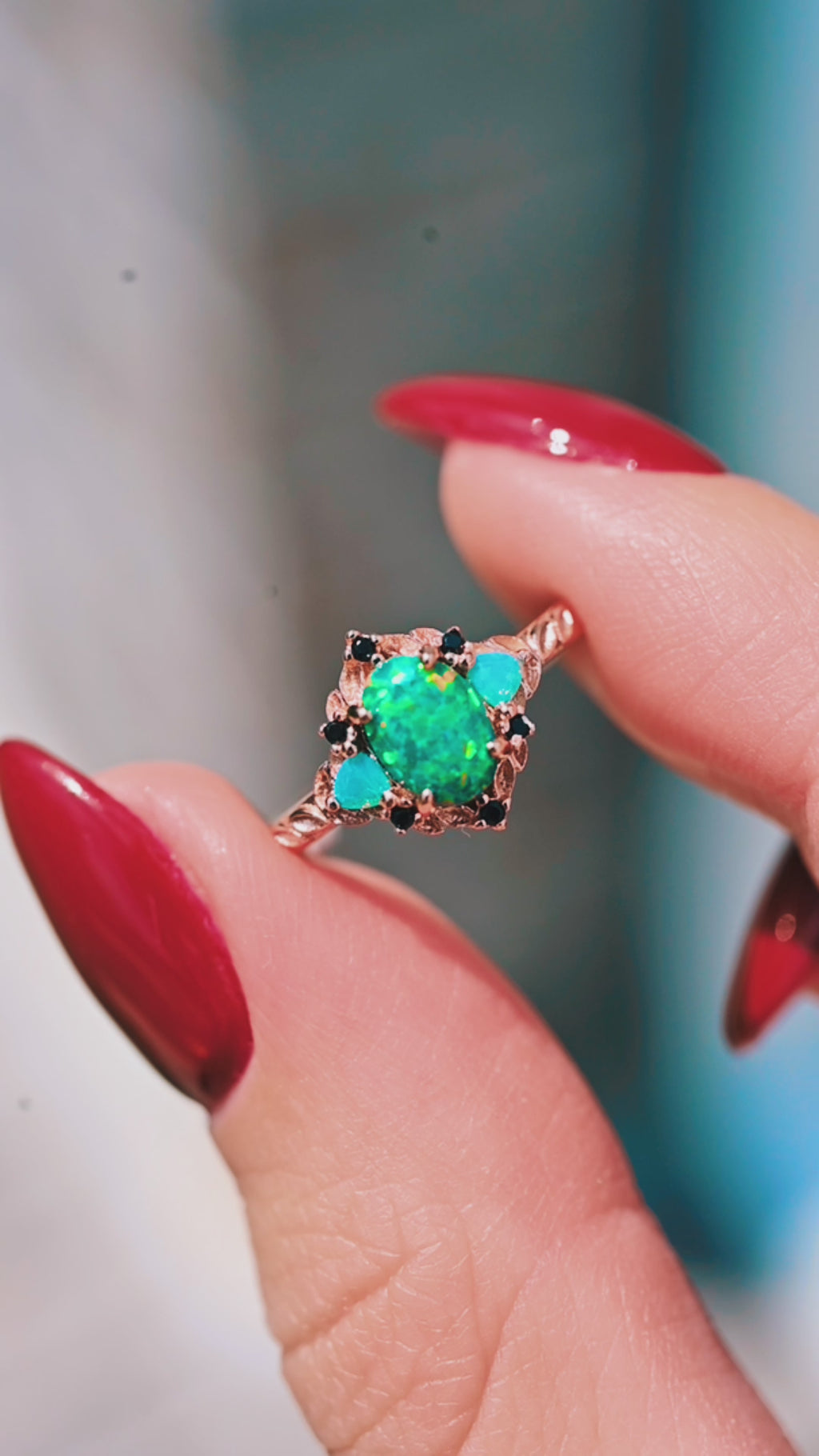 Embrace the enchantment of nature with this captivating Green Fire Opal and Opalescent Sapphire Ring. Exquisitely crafted in 14K rose gold vermeil, this engagement ring captures the essence of fairy core aesthetics, making it a perfect choice for those who adore whimsical and ethereal designs.