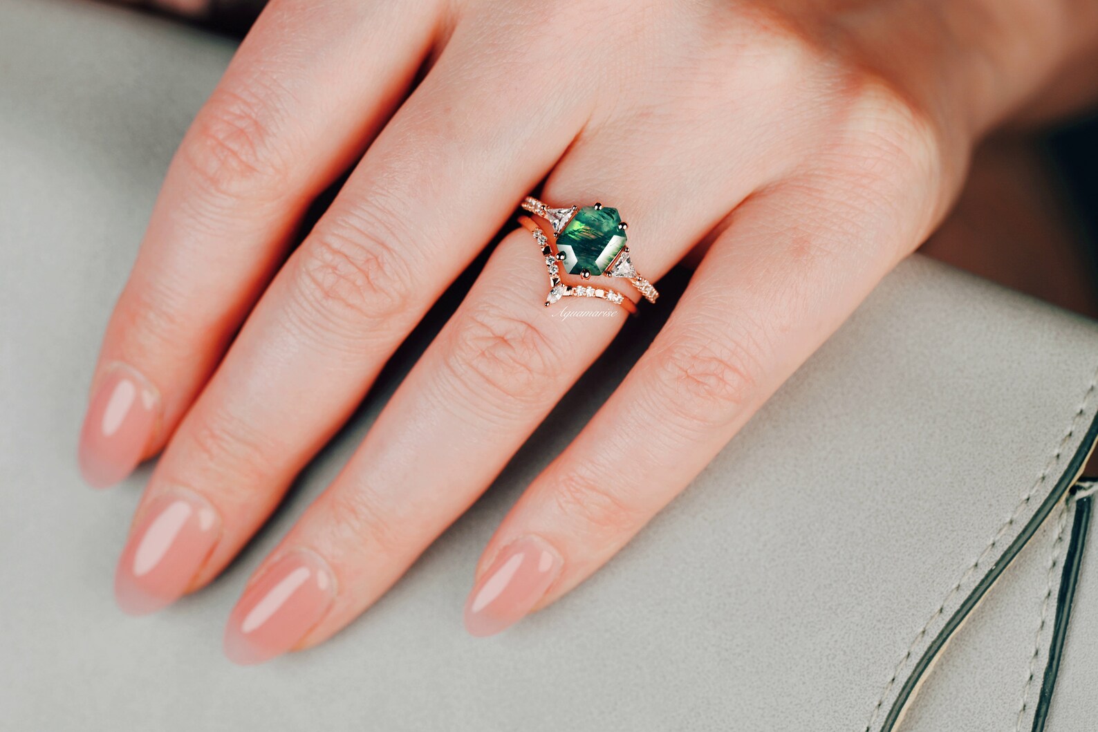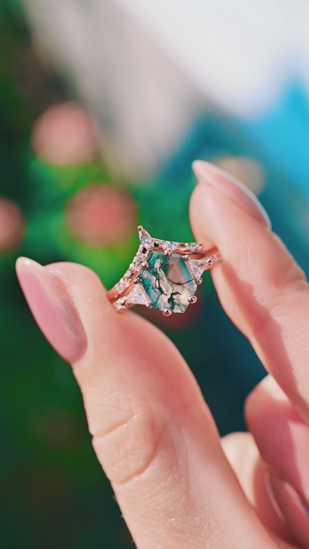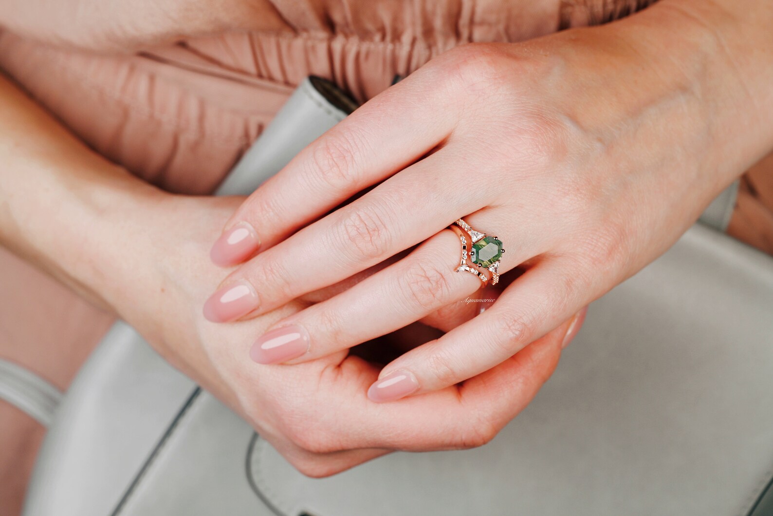 Every moss agate stone is one-of-a-kind, featuring natural inclusions that resemble moss or forest landscapes within the gem. Colors and patterns will vary, ensuring your ring set is truly unique.
