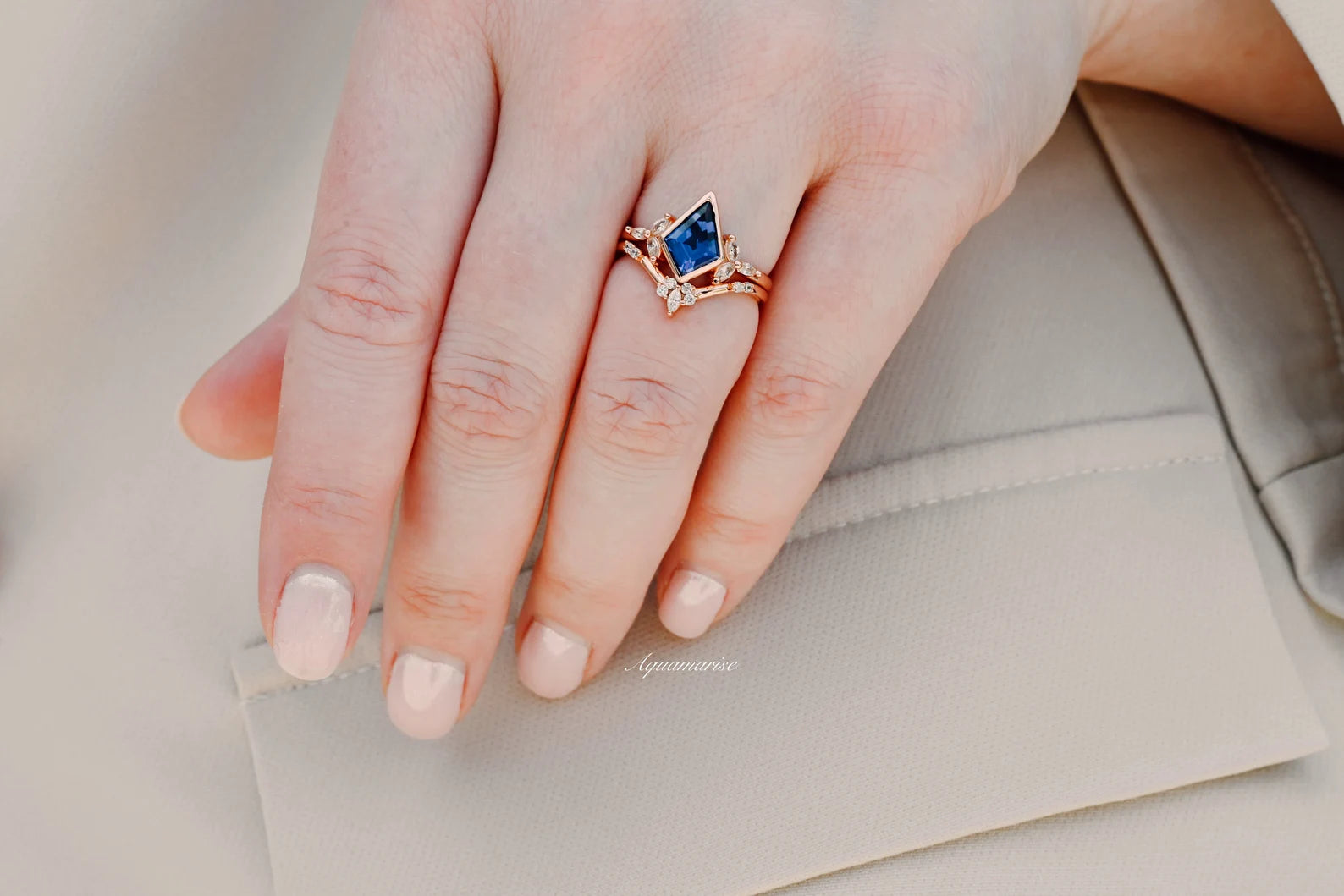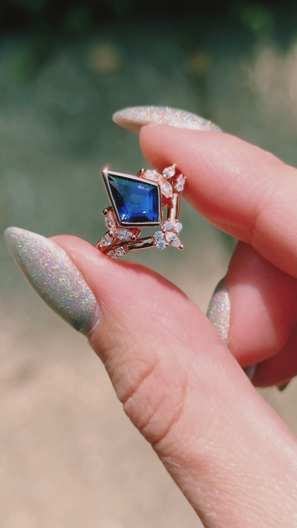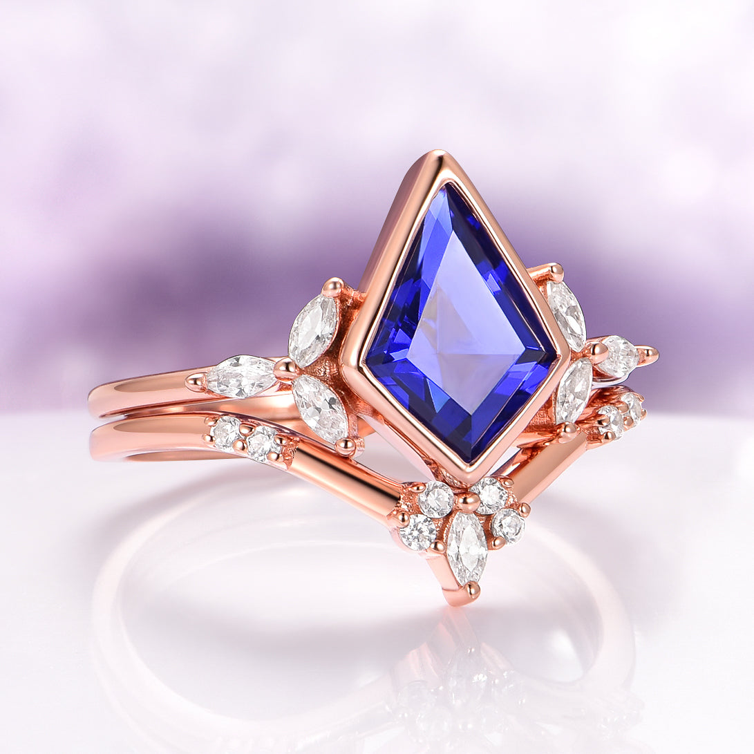 Gorgeous and timeless, this Vintage Inspired Blue Sapphire Ring Set combines elegance with a touch of modern artistry. Designed with a kite-cut sapphire, the deep blue gemstone is set in 14K rose gold over solid sterling silver, accented with sparkling simulated diamonds (CZ). A versatile piece, this ring can be worn as an engagement ring, promise ring, birthstone ring, or statement piece.