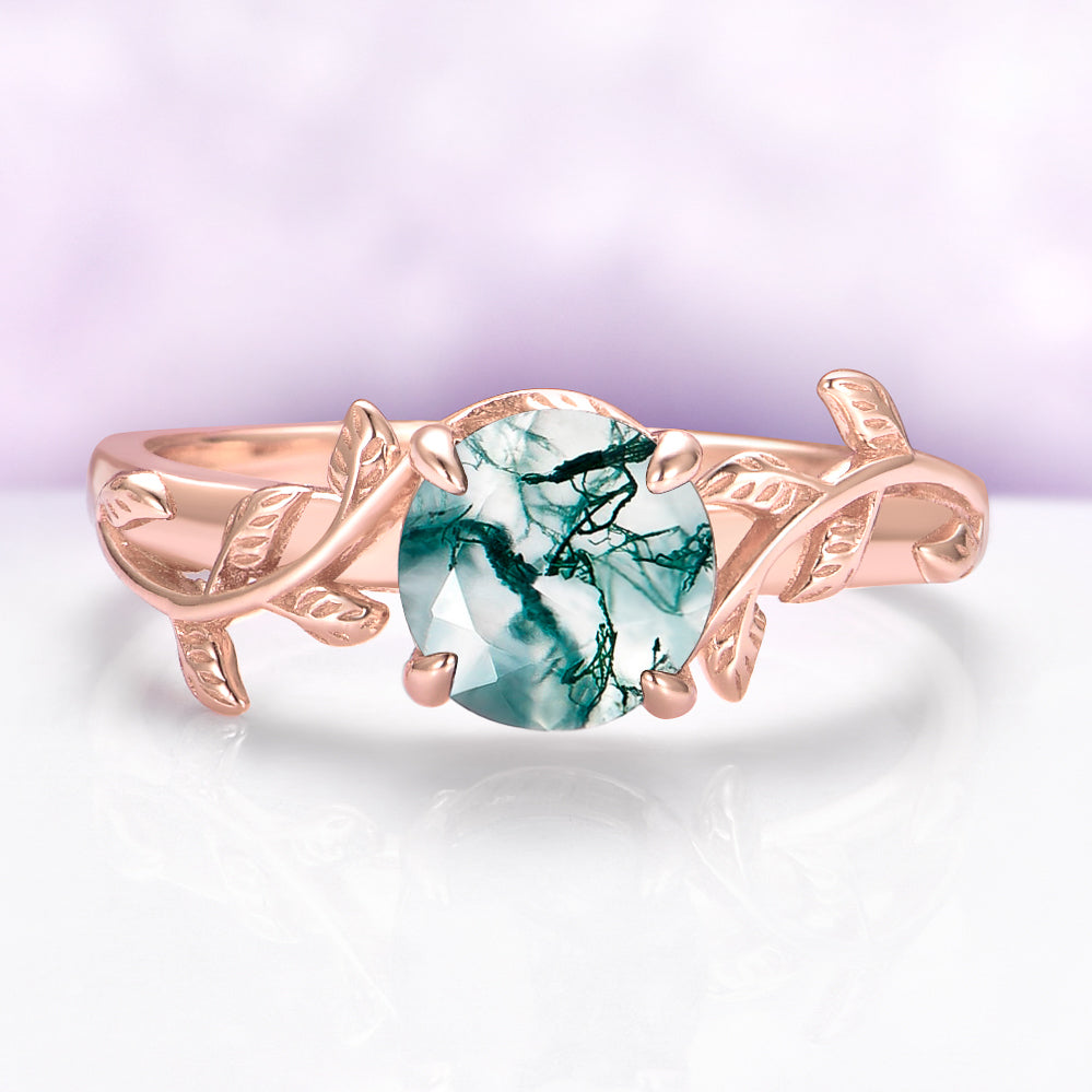 At its center sits a 7mm round natural green moss agate, showcasing intricate moss-like inclusions suspended within translucent stone. No two moss agates are ever identical, making each ring uniquely yours — a miniature landscape shaped by nature itself.