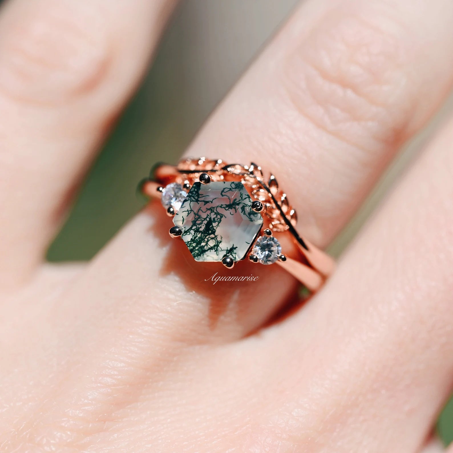 Natural Hexagon Moss Agate Engagement Ring Set- 14K Rose Gold Vermeil