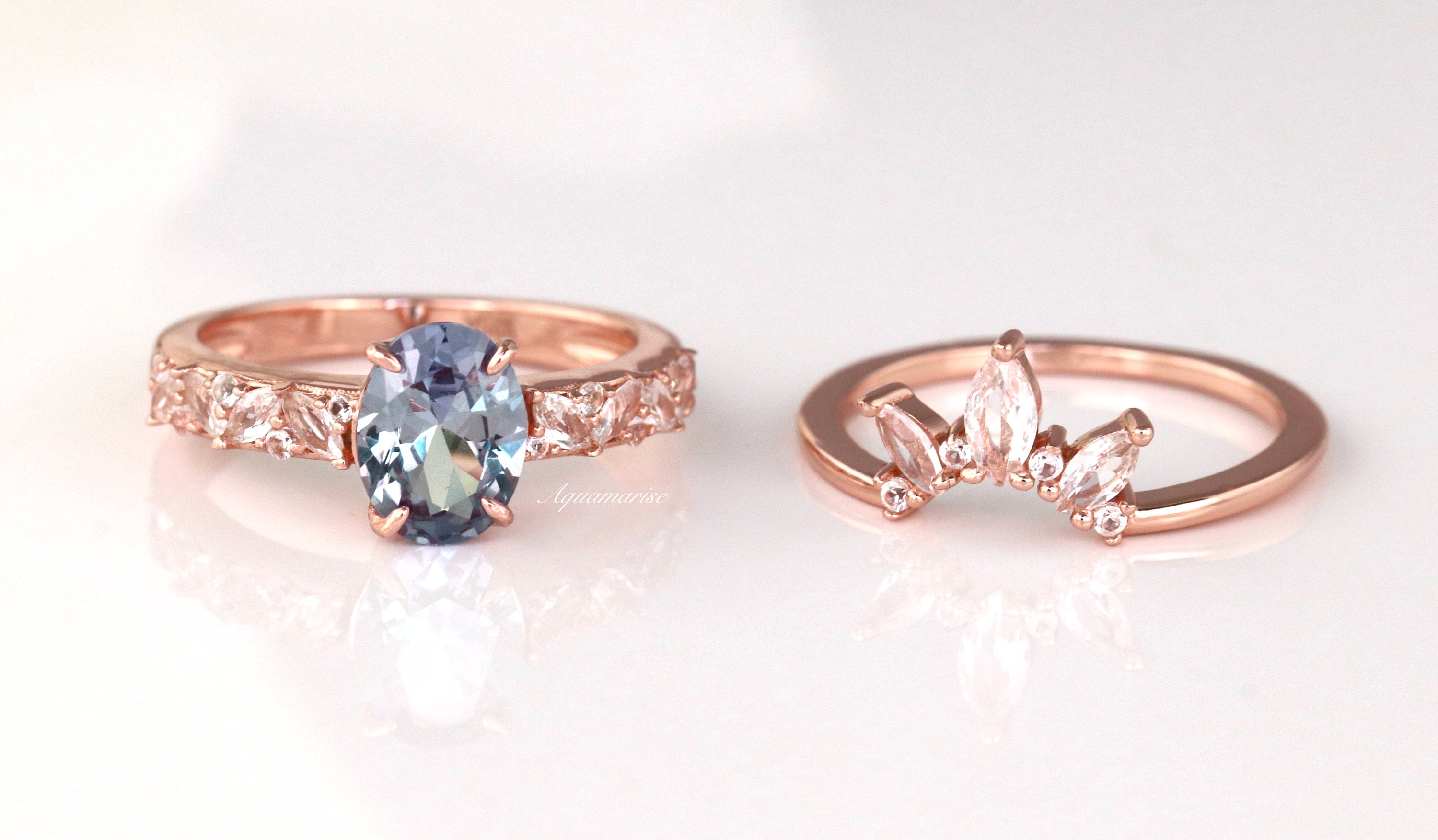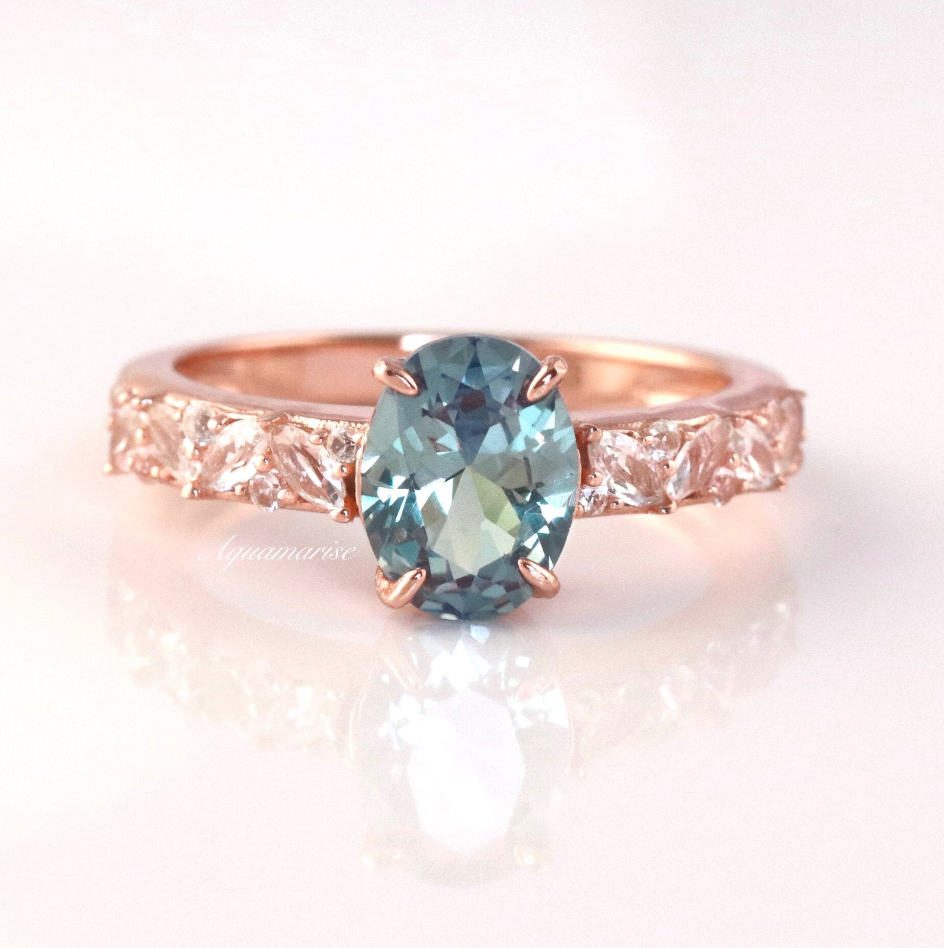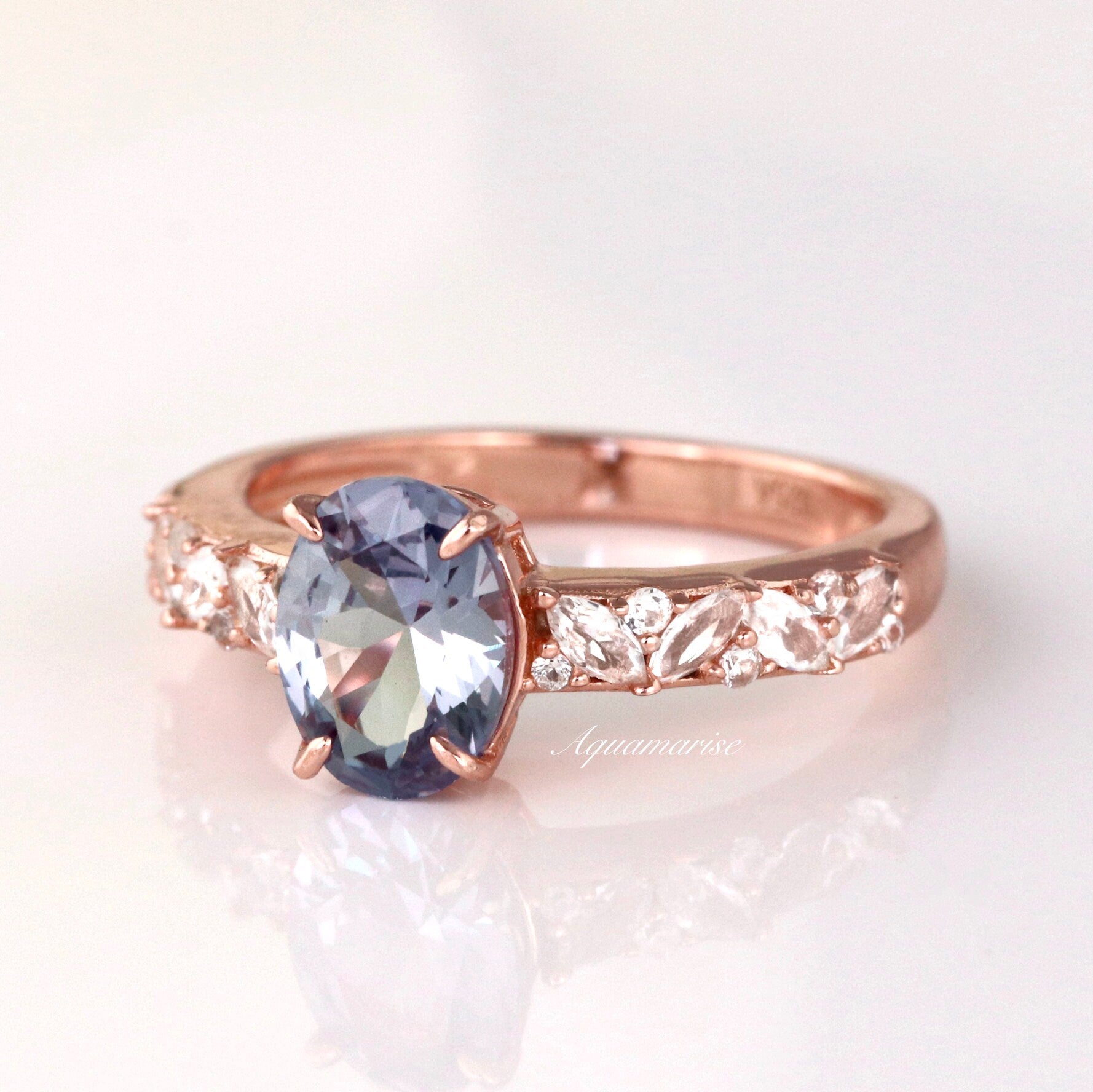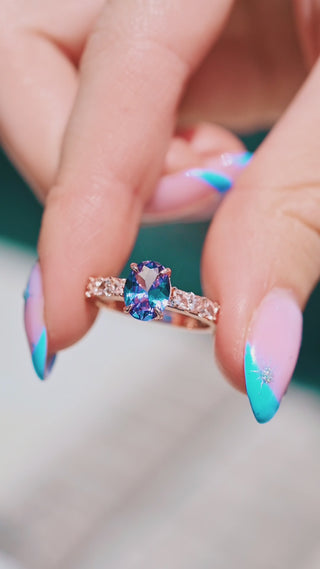 This stunning Oval Alexandrite Ring is crafted in 14K rose gold vermeil over solid 925 sterling silver, featuring a mesmerizing lab-grown alexandrite center stone known for its magical color shift. With hues of deep purple and green that change under different lighting, this ring makes a one-of-a-kind statement—perfect for engagements, promise rings, anniversaries, or meaningful birthday gifts for someone special born in June.
