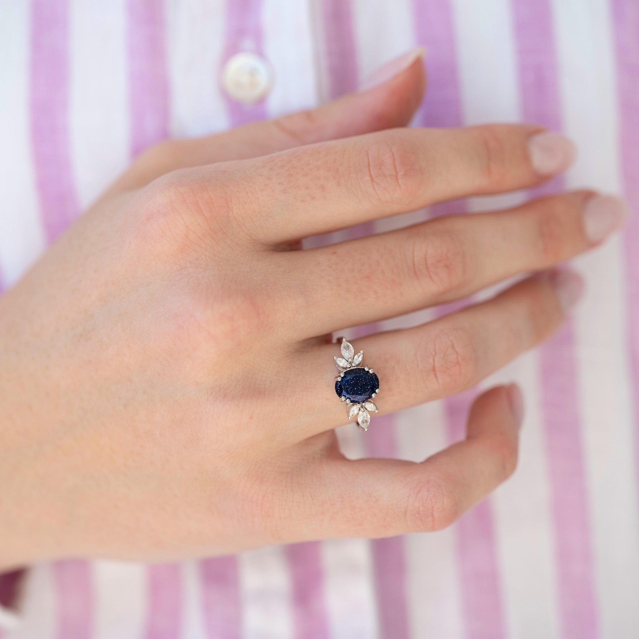 The Eva Galaxy Sandstone Ring in 14k White Gold is a vintage-inspired treasure, designed for those who love timeless elegance with a touch of celestial charm. At the heart of this ring lies a natural blue sandstone, admired for its deep midnight-blue hue flecked with sparkling inclusions that resemble a starry night sky. Its captivating center stone is beautifully framed by sparkling accent stones, choose between moissanite for exceptional brilliance or natural diamonds for an heirloom-worthy finish. Crafted in solid 14k white gold, this design evokes a romantic vintage aesthetic with intricate detailing that enhances the cosmic beauty of blue sandstone.