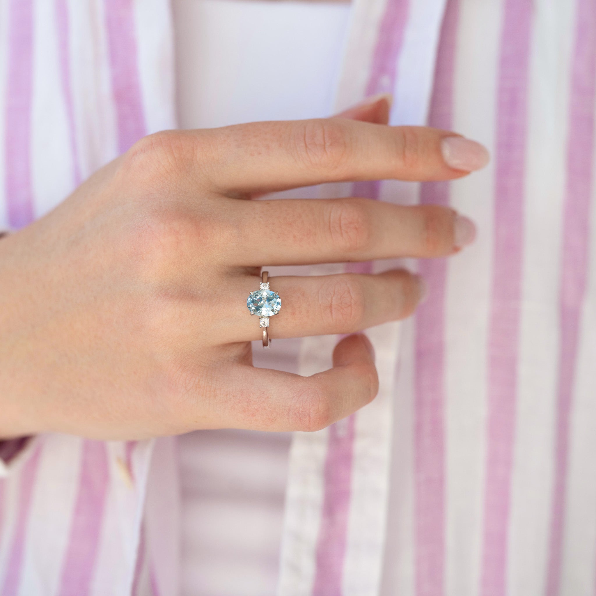 Introducing the Everly Oval Cut Aquamarine Engagement Ring, a timeless design that radiates serenity, elegance, and devotion. Handcrafted in solid 14K white gold, this refined piece features an oval-cut natural aquamarine, admired for its tranquil blue glow that symbolizes clarity, harmony, and everlasting love. The sleek band highlights the aquamarine’s brilliance with a single accent stone on each side, available in your choice of moissanite or natural diamonds. Simple yet captivating, this engagement ring is a graceful expression of love designed to be cherished for a lifetime.