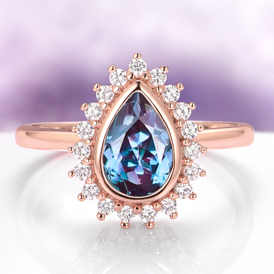 Lab Alexandrite Halo Engagement Ring in Solid 14K Rose Gold