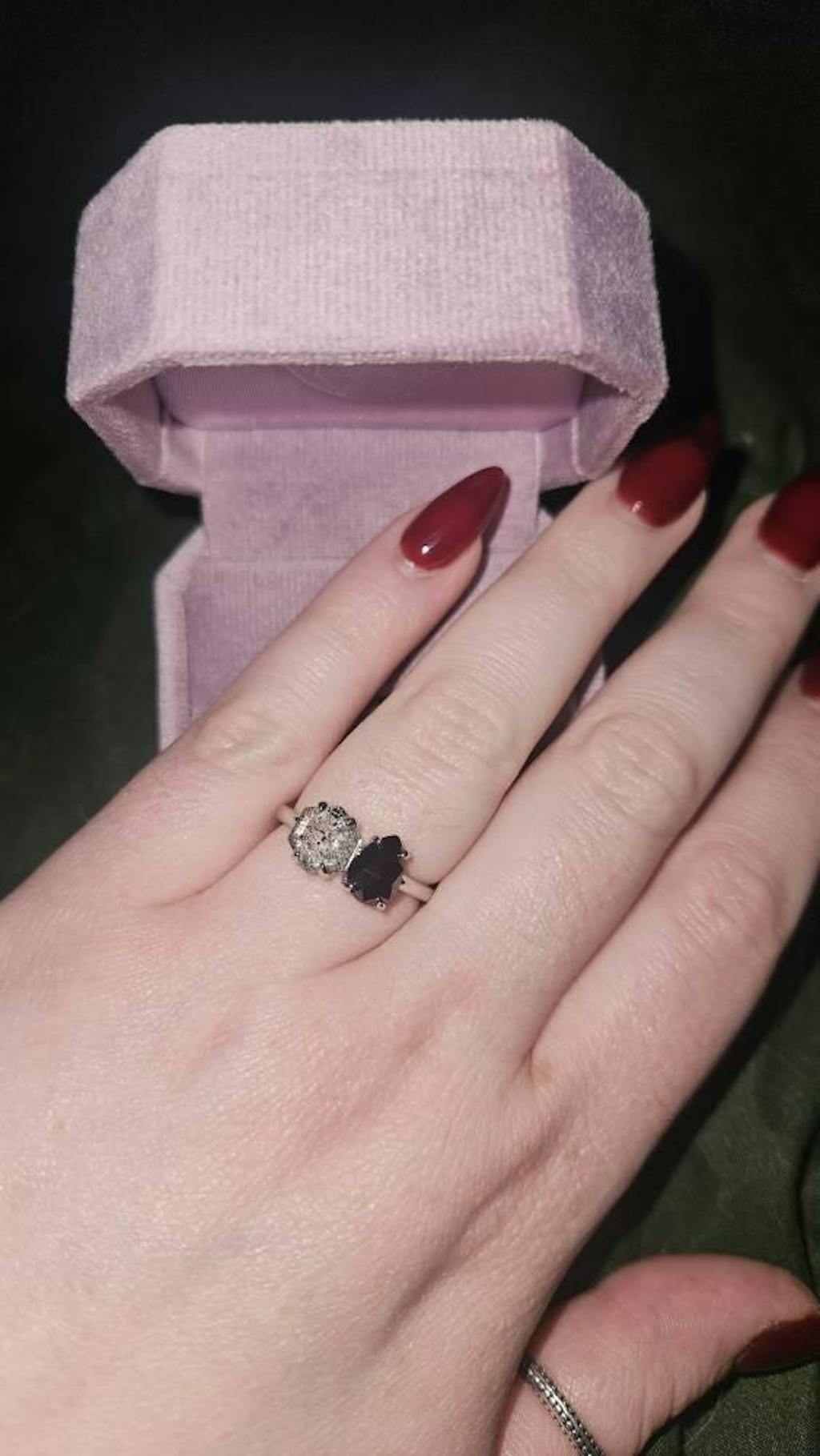 Introducing the "Toi Et Moi Sterling Silver Natural Herkimer" engagement ring – a mesmerizing union of celestial elegance and modern sophistication. This exquisite piece features a hexagon-cut Galaxy Natural Herkimer Diamond and a pear-cut Black Onyx, skillfully set in a lustrous Sterling Silver band.