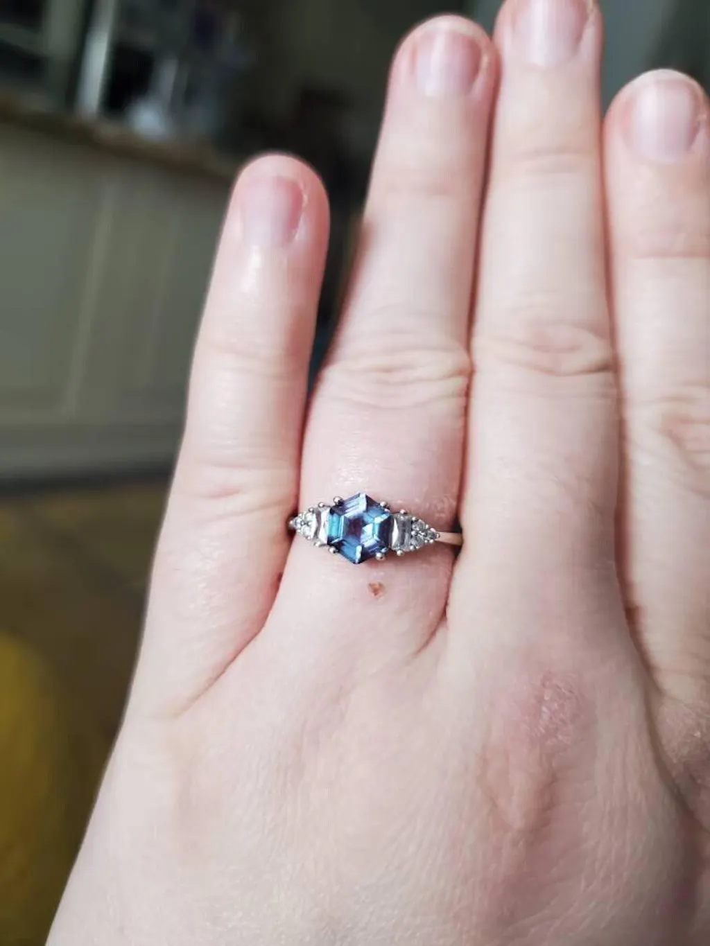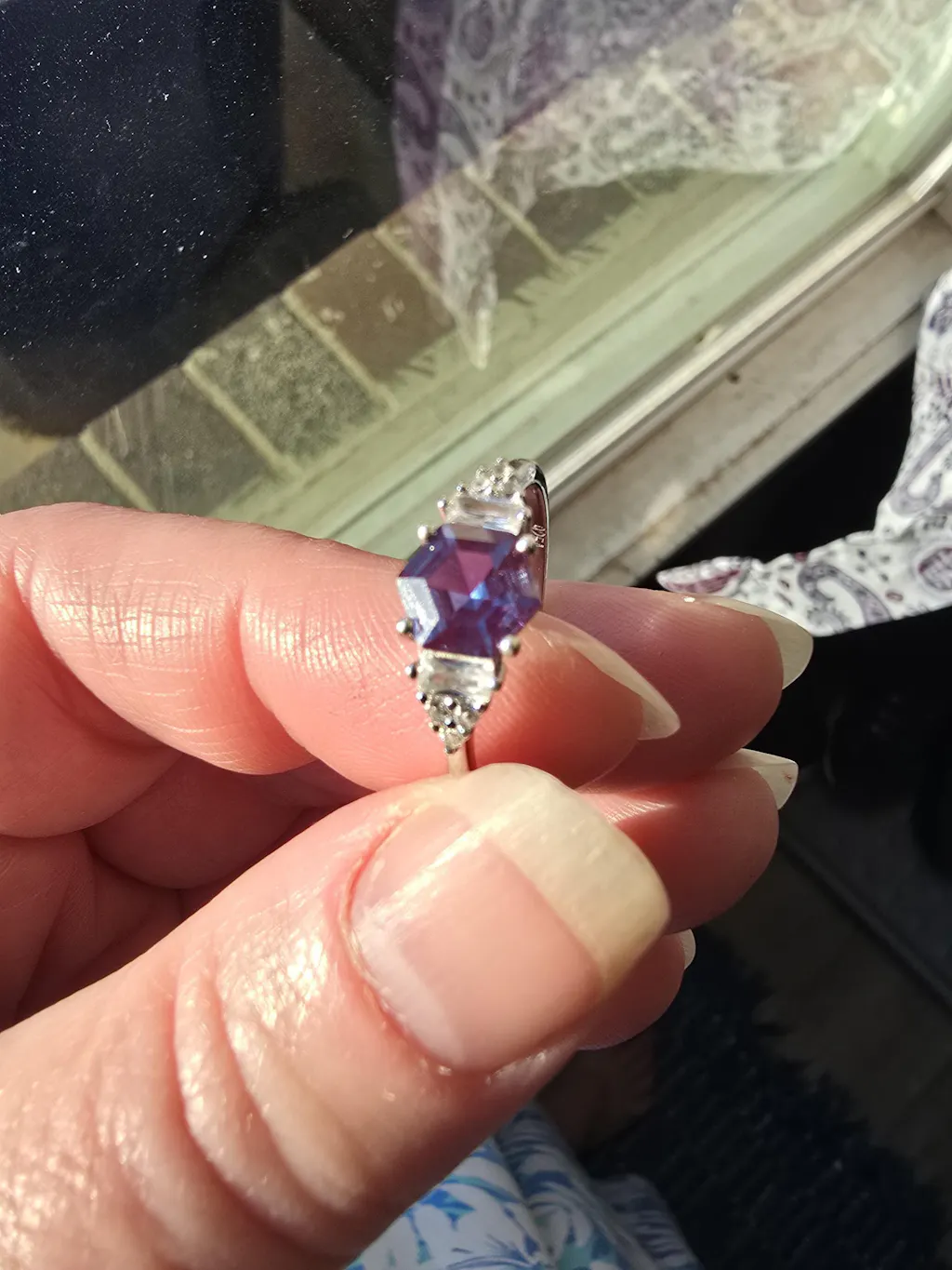 This ring is so beautiful. It's even more stunning than the photos, and truly does shift from a green to blue to purple and every shade in between! I haven't been able to stop staring at it, and the quality is even better than I could have hoped. My fiance bought this for me, and he chose the hexagon cut which OMG- the way it sparkles when it catches the light is unreal!! Thank you for making such a stunning ring for me.