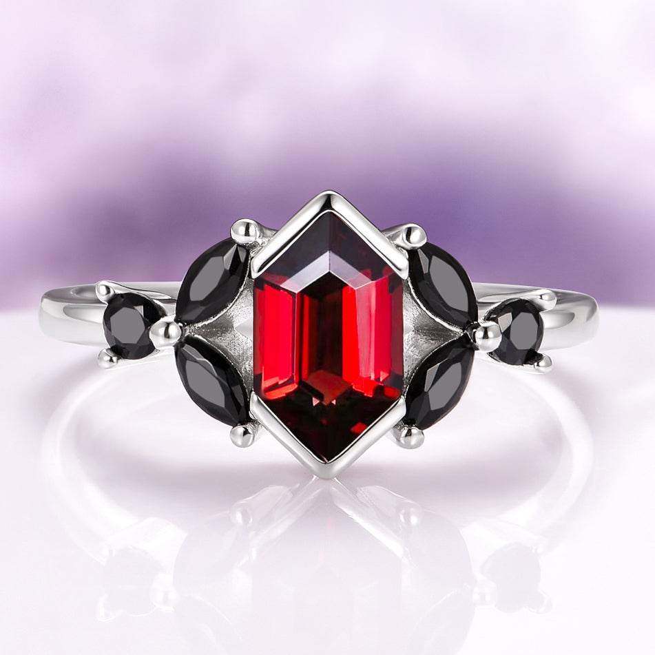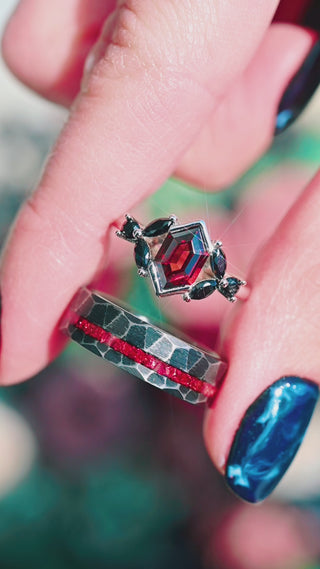 ►His rings are forged from the finest quality brushed hammered black tungsten, renowned for its durability and resilience, ensuring a lifetime of enduring beauty and significance. The lustrous red garnet, carefully embedded within each band, adds a touch of fiery allure and passionate romance, symbolizing the fiery ardor and profound connection shared between two souls.