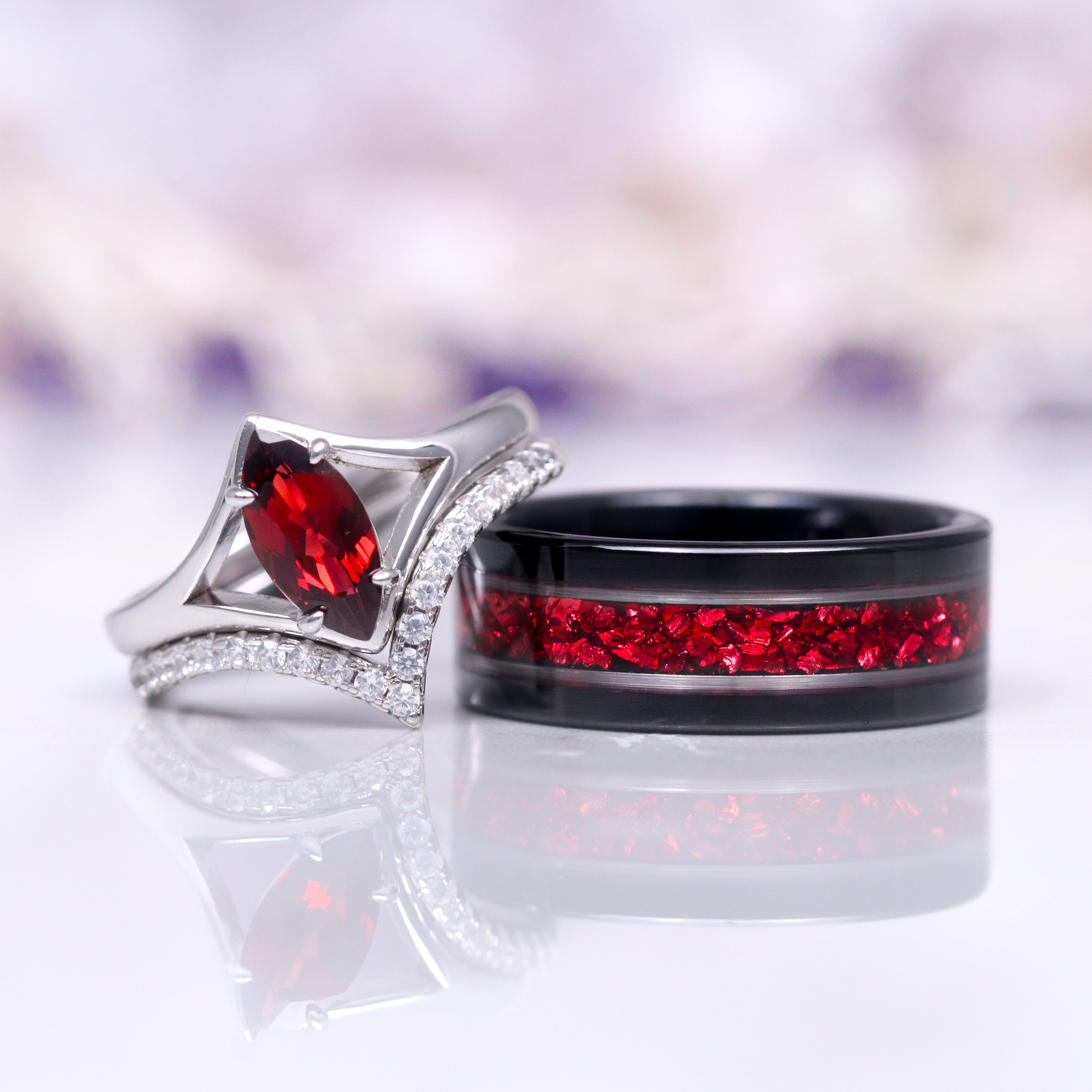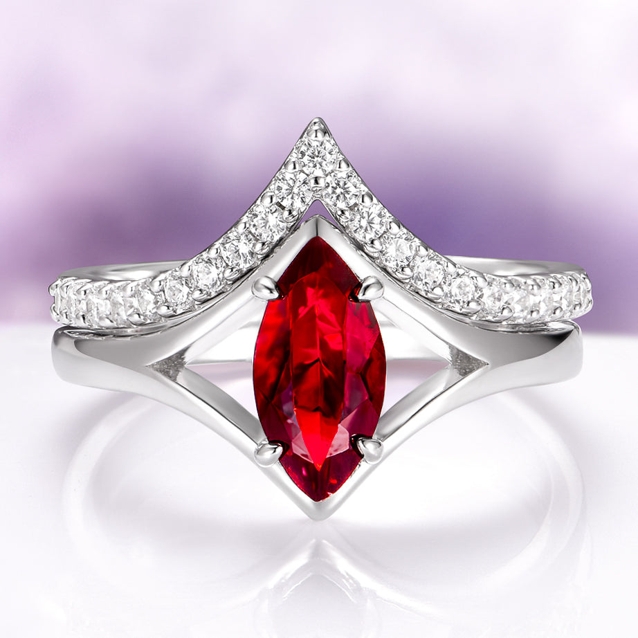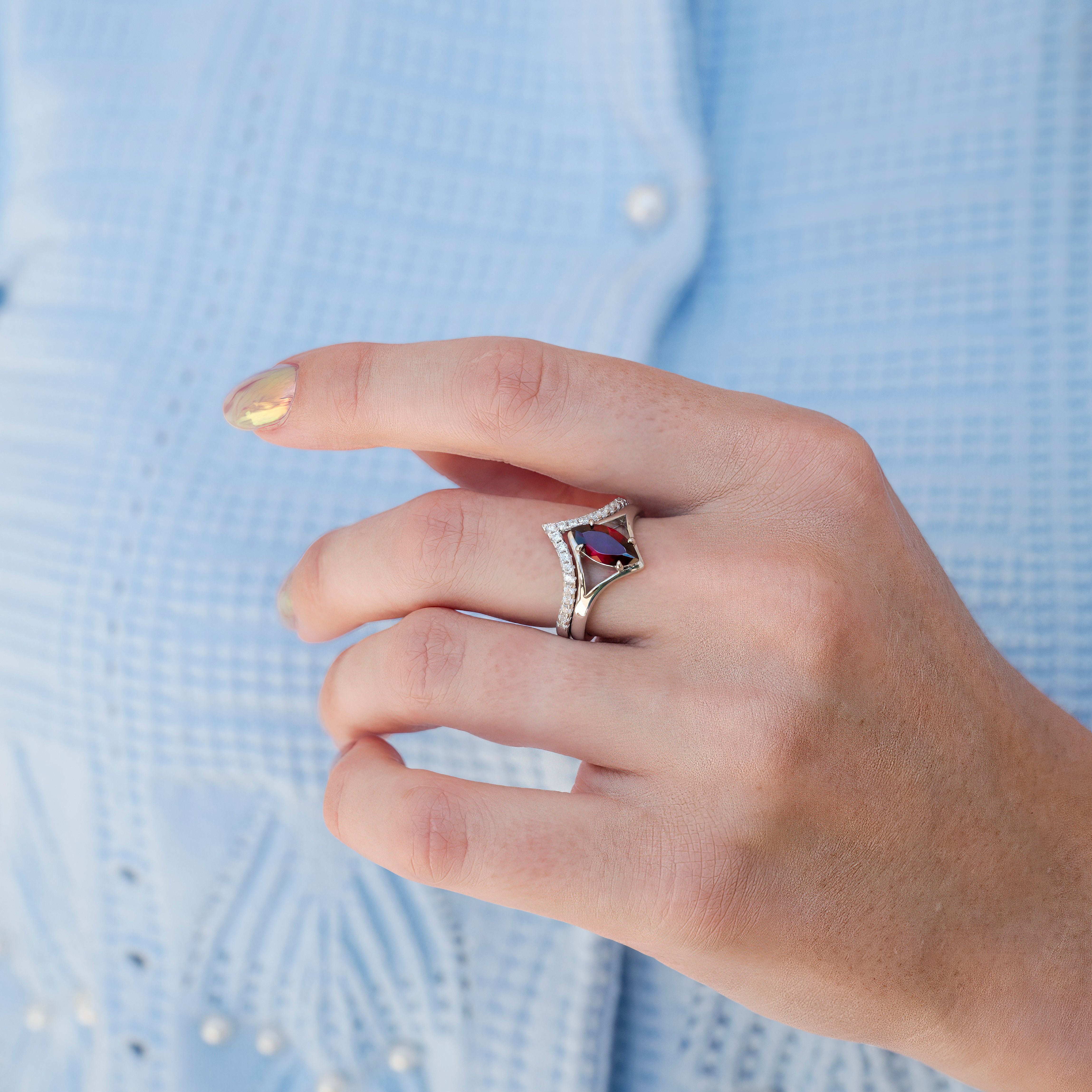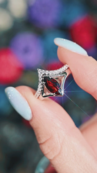 Celebrate love and passion with this Natural Marquise Cut Red Garnet Ring Set, crafted in 14k white gold for timeless elegance. The set features a stunning marquise-cut natural red garnet, known for its deep crimson hue and symbolic connection to love and commitment. The minimalist design of the engagement ring is paired perfectly with a complementary chevron band, creating a modern yet romantic look.