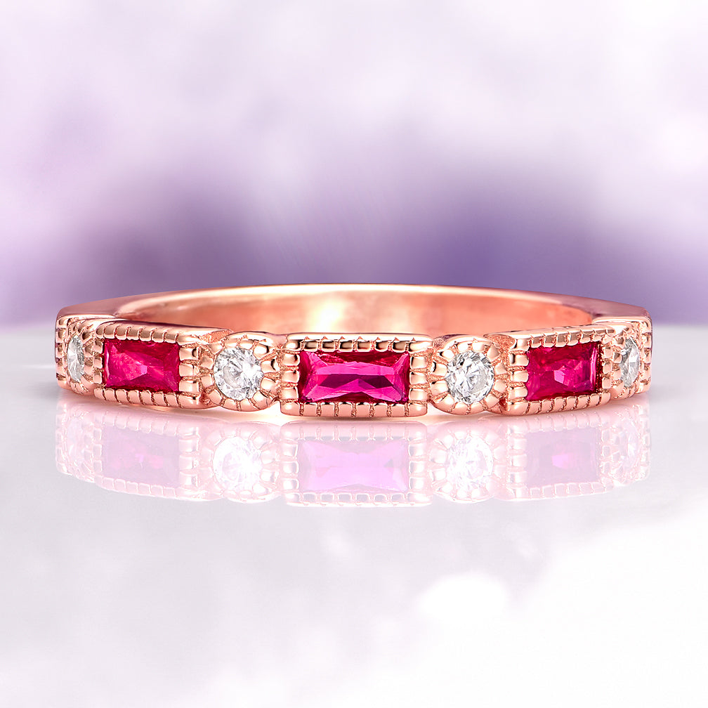 This gorgeous vintage-inspired ruby ring features a timeless milgrain design that brings together elegance and simplicity. Crafted in 14K rose gold vermeil over 925 sterling silver, this lightweight piece makes the perfect engagement ring, promise ring, birthstone ring, or statement accessory. The emerald-cut lab-grown ruby, accented by shimmering round simulated diamonds, creates a striking yet refined look.