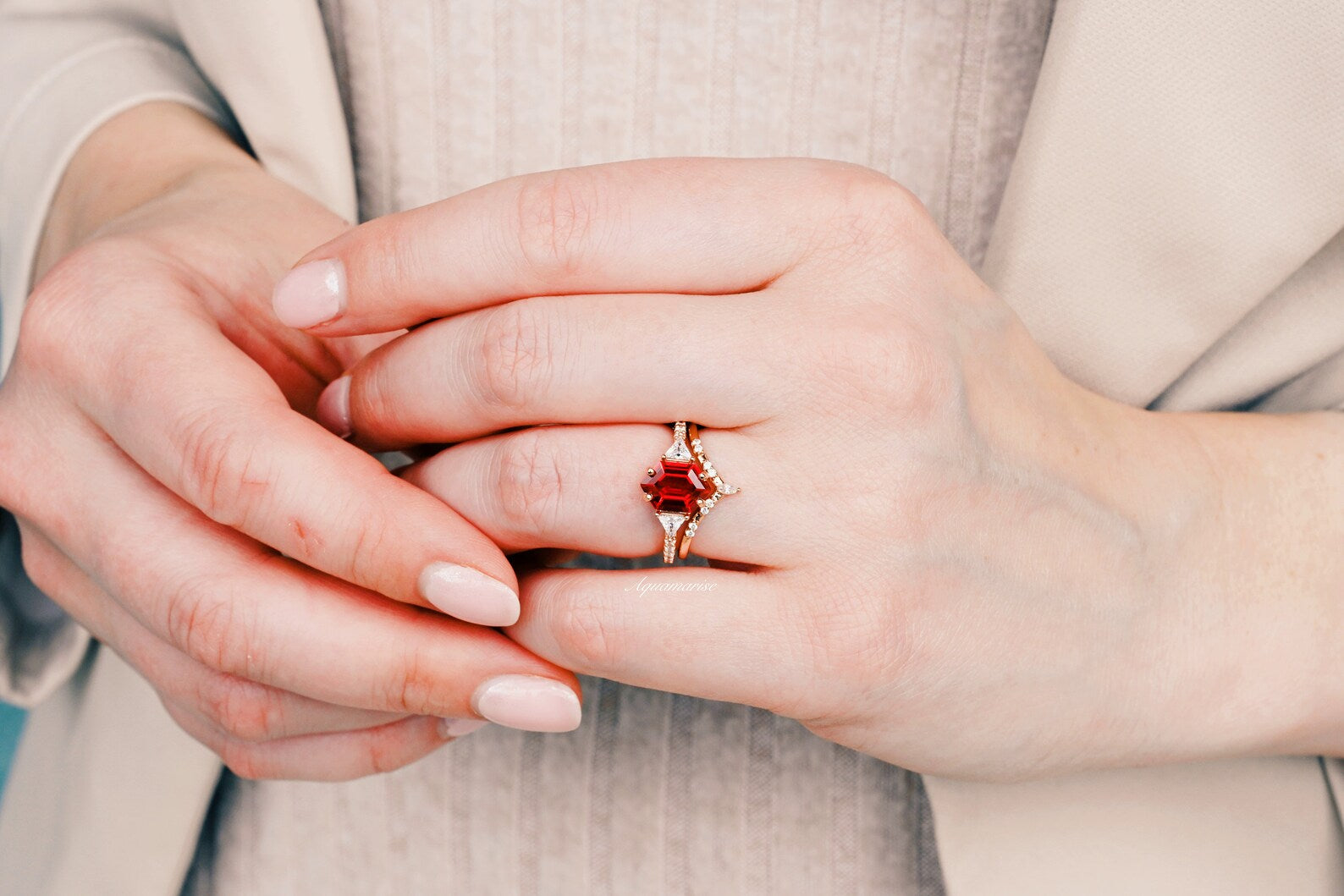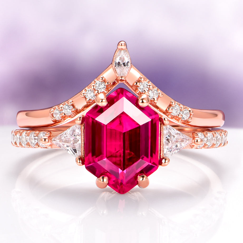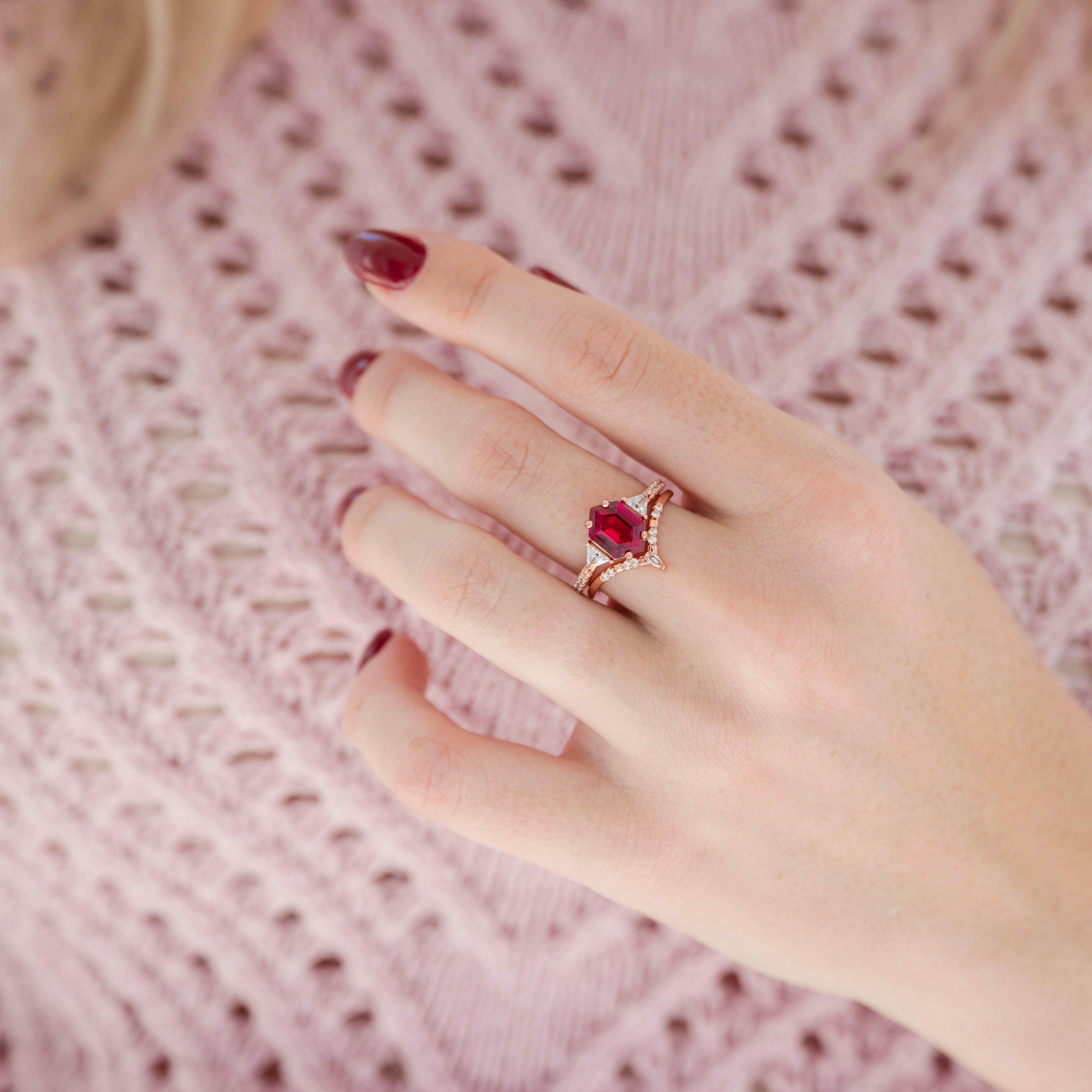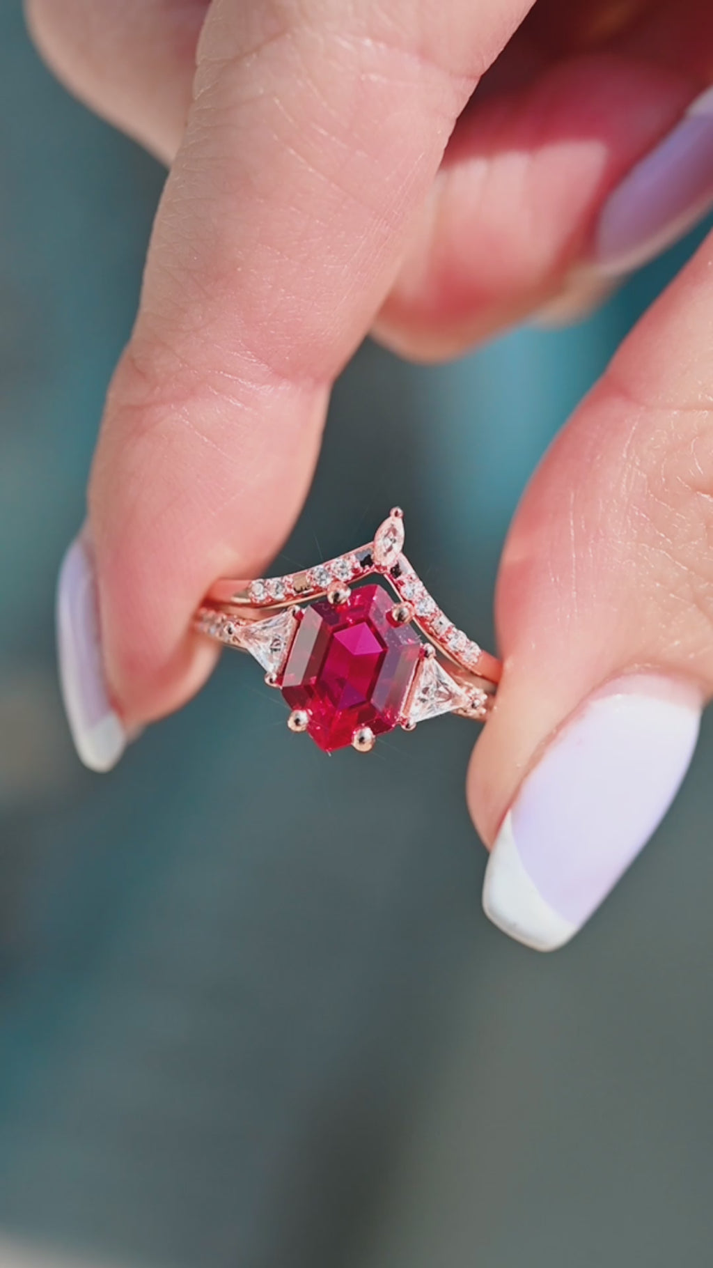 Crafted in 14K rose gold vermeil over 925 sterling silver, this vintage inspired ruby ring set offers timeless elegance with a modern twist. Designed for versatility, it can be worn as an engagement ring, promise ring, birthstone ring, or statement piece, making it a meaningful choice for any occasion.