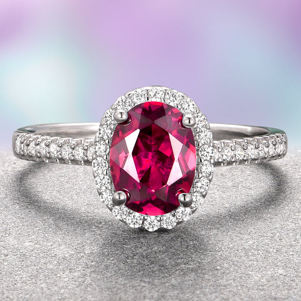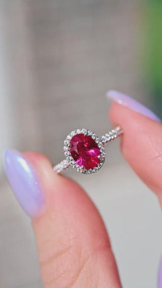 Delicate and radiant, the Iris Ruby Ring in 14K Solid White Gold features a vivid lab-grown ruby center stone in a graceful halo setting, accented by your choice of sparkling moissanite or natural diamonds. This non-traditional engagement ring blends timeless elegance with bold, passionate color.