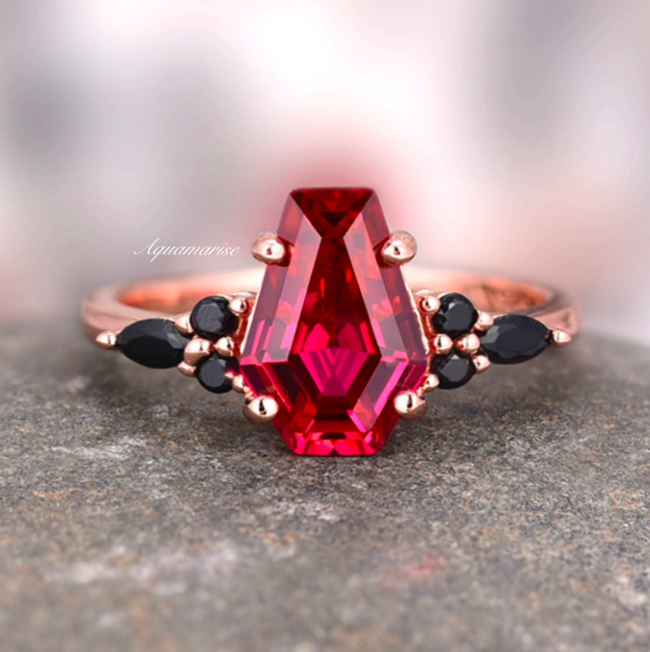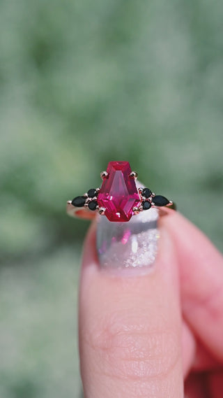 ► Her Ring: Romantic and dramatic, her 925 sterling silver band is finished in 14K rose gold vermeil and showcases a 7x10mm (~2.1 ct.) coffin-cut lab-grown ruby. Natural black onyx accents enhance its mysterious allure, while the rose gold setting adds warmth and timeless elegance.