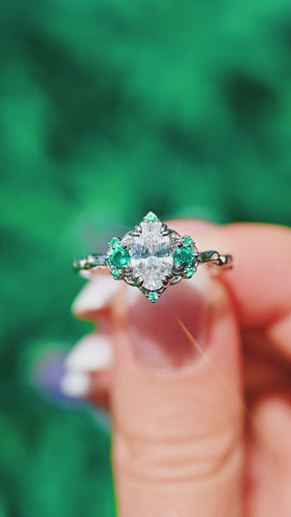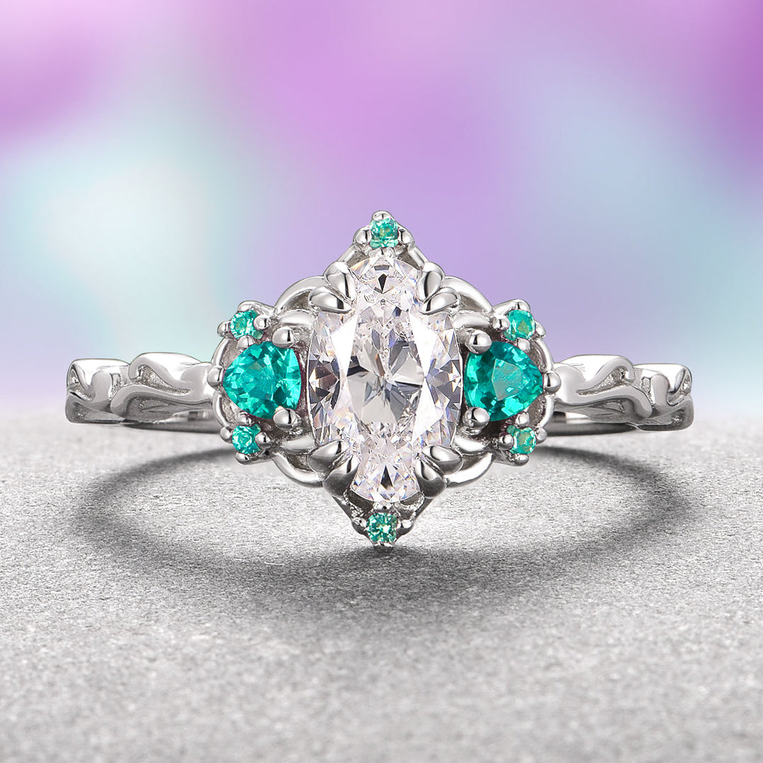 ►The lab-grown diamond offers exceptional brilliance and ethical craftsmanship, symbolizing purity, strength, and enduring love. Complementing it, the vivid green Paraiba tourmaline accents bring a striking touch, cherished for their symbolism of energy, transformation, and inspiration. This enchanting design is ideal for lovers of fantasy-inspired jewelry, fairycore engagement rings, and distinctive gemstone jewelry. Whether chosen as a unique engagement ring, promise ring, or special gift, the Esme Ring infuses every love story with luminous beauty and magical charm.