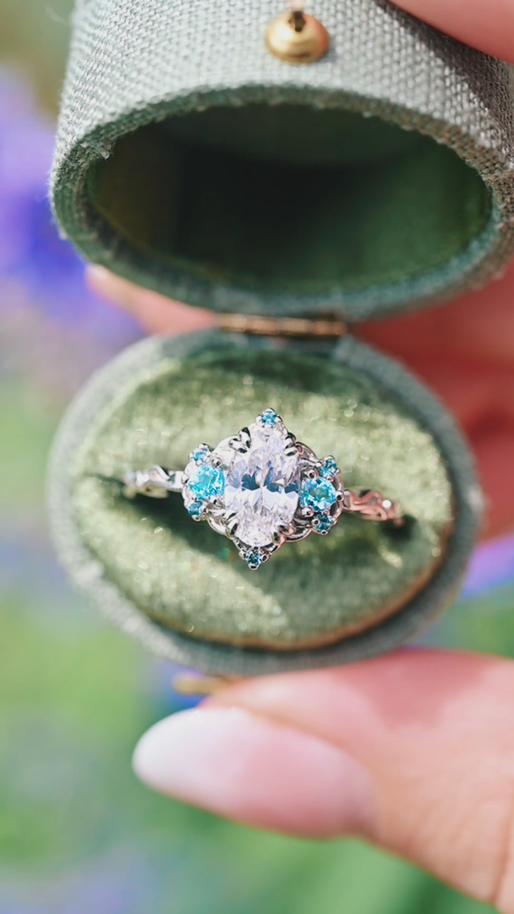 ►The lab-grown diamond offers exceptional brilliance and ethical craftsmanship, symbolizing purity, strength, and enduring love. Complementing it, the serene sky blue topaz accents bring a calming pop of color, cherished for their symbolism of tranquility, clarity, and harmony. This enchanting design is ideal for lovers of fantasy-inspired jewelry, fairycore engagement rings, and distinctive gemstone jewelry. Whether chosen as a unique engagement ring, promise ring, or a special gift, the Esme Ring infuses every love story with luminous beauty and magical charm.