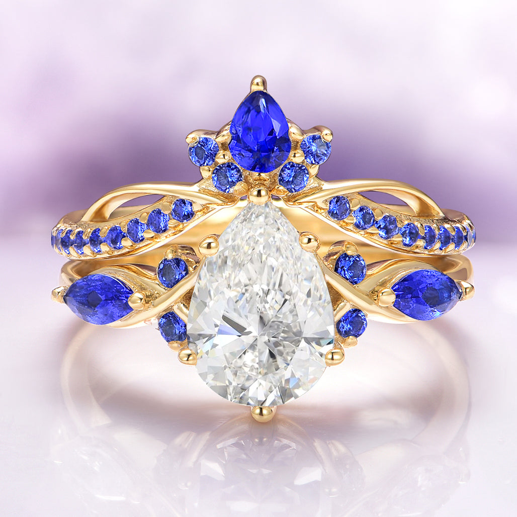 ►The centerpiece features a brilliant lab-grown diamond, renowned for its exceptional sparkle and fire. Flanking the center stone are vibrant lab-grown blue sapphire accents, cherished for their deep, celestial hues and symbolism of wisdom, loyalty, and enduring love. The yellow gold band is intricately adorned with delicate, nature-inspired details, evoking the ethereal beauty of a fairy-tale forest.