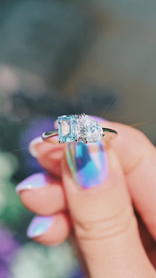 Whether you're looking for a non-traditional engagement ring or a romantic statement piece, this Toi et Moi ring blends timeless elegance with modern sentiment. The soft blue aquamarine paired with the crisp brilliance of a lab-grown diamond symbolizes clarity, harmony, and everlasting connection.