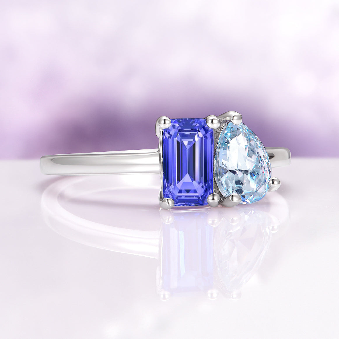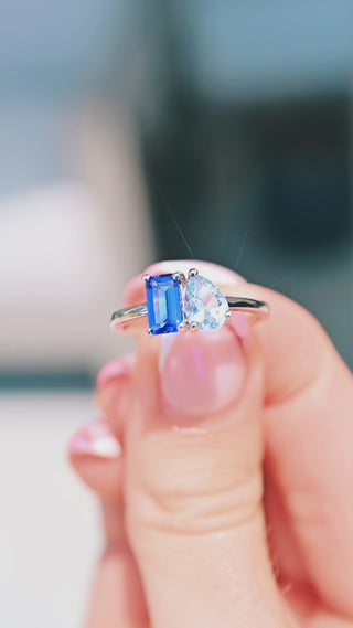 ► Blue/Purple Sapphire & Aquamarine Ring – Featuring a lab-grown 4x7mm emerald cut sapphire paired with a natural 5x7mm pear cut aquamarine. The deep blue sapphire represents loyalty, wisdom, and devotion, while the aquamarine embodies tranquility, harmony, and clarity.