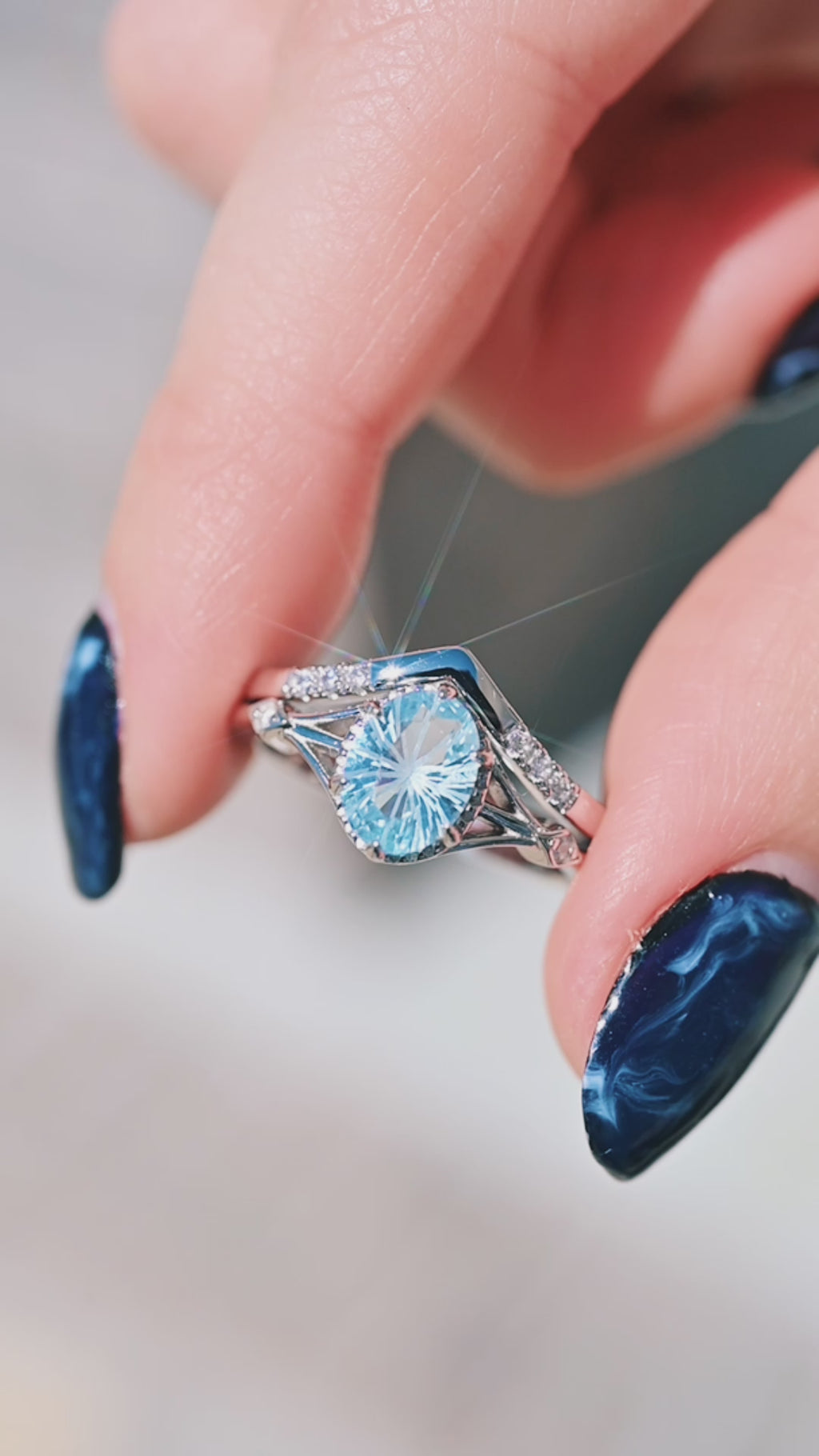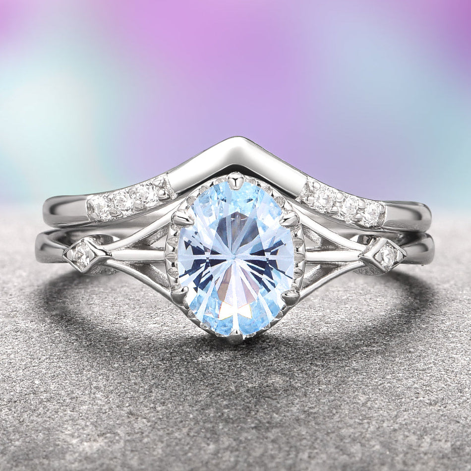 ► Her Ring: Elegant and romantic, her 925 solid sterling silver engagement ring showcases a sparkling 6x8mm (approx. 1.2ct) fireworks cut simulated aquamarine center stone, accented by shimmering simulated diamonds (CZ). The Celtic-inspired detailing embraces the gem, celebrating love, loyalty, and timeless devotion.