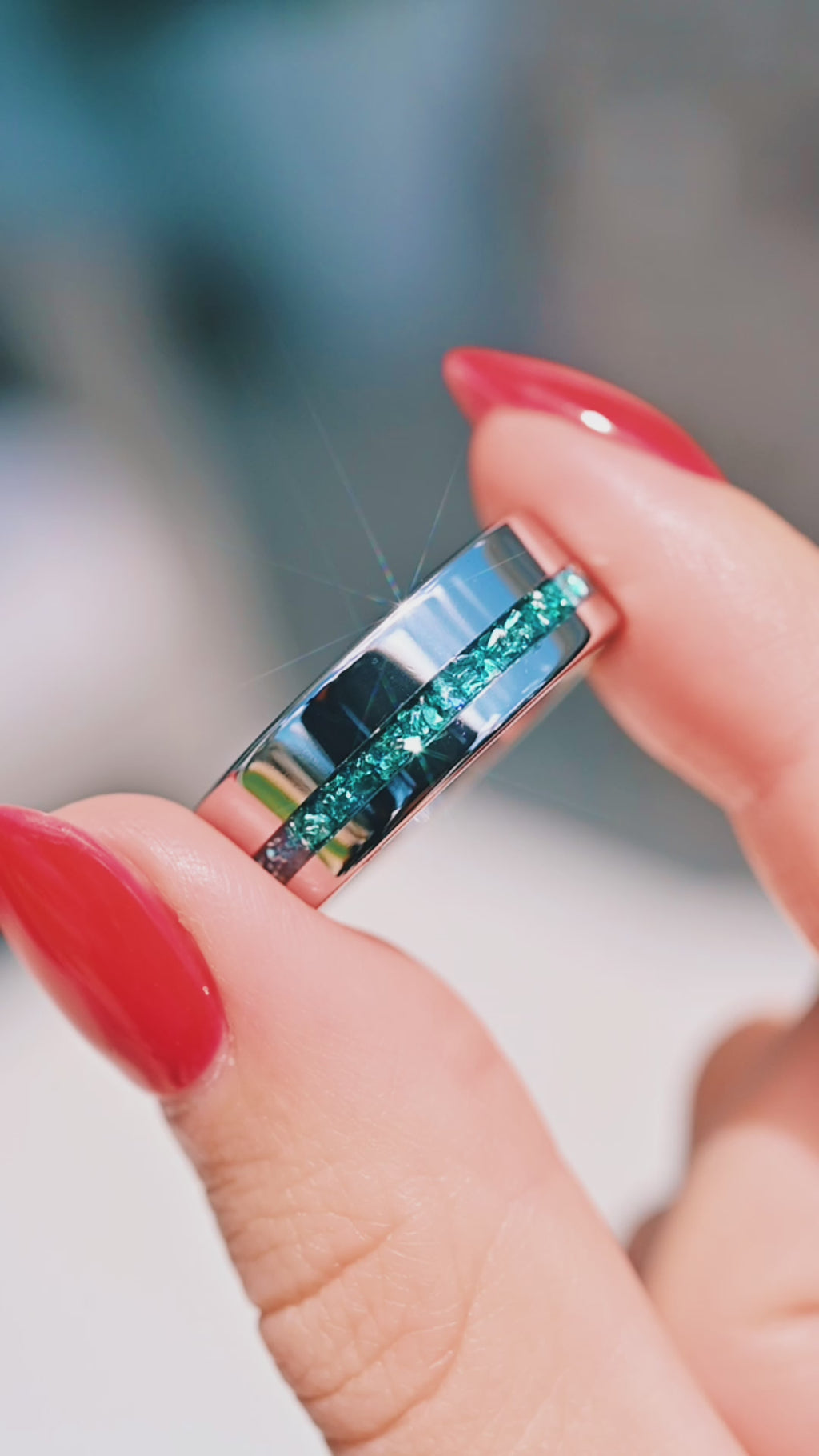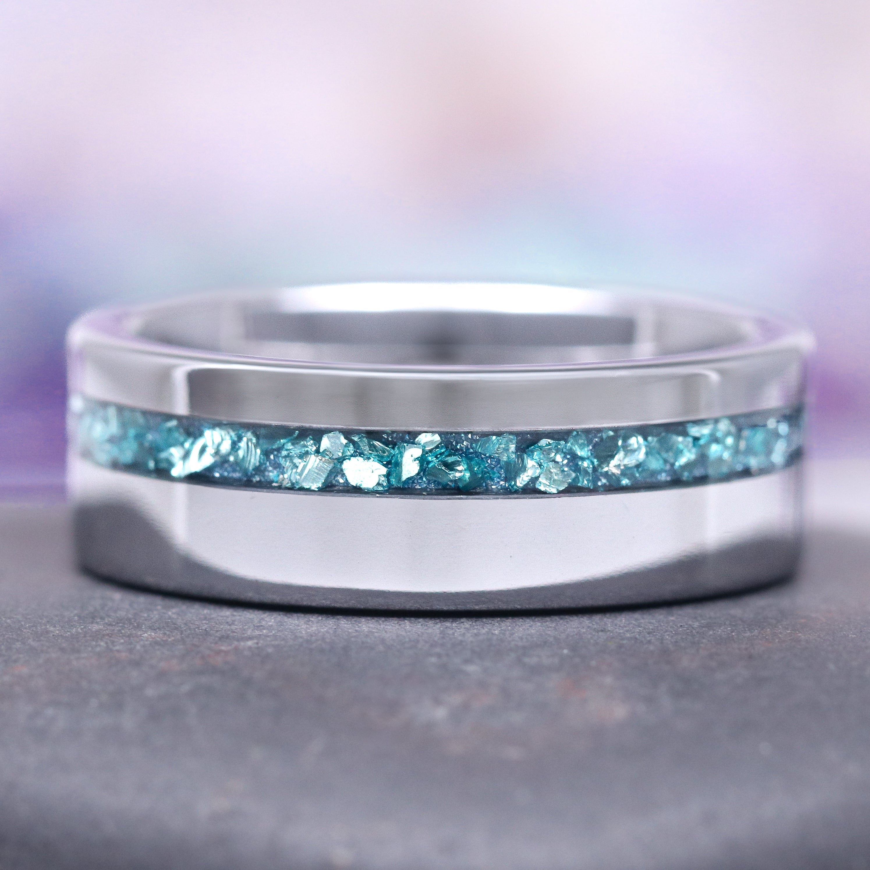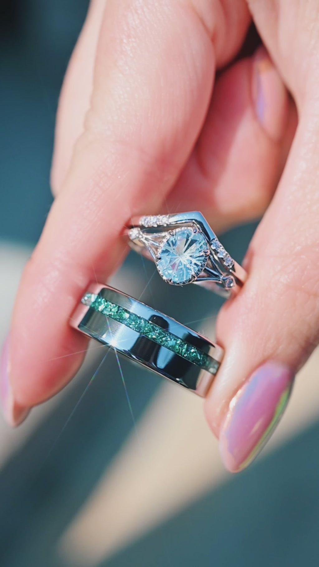 ► His Ring: Crafted from durable tungsten carbide, this 8mm band features a bold crushed aquamarine inlay, symbolizing eternal love and unity. Its polished finish and comfort-fit interior make it both striking and durable for everyday wear.