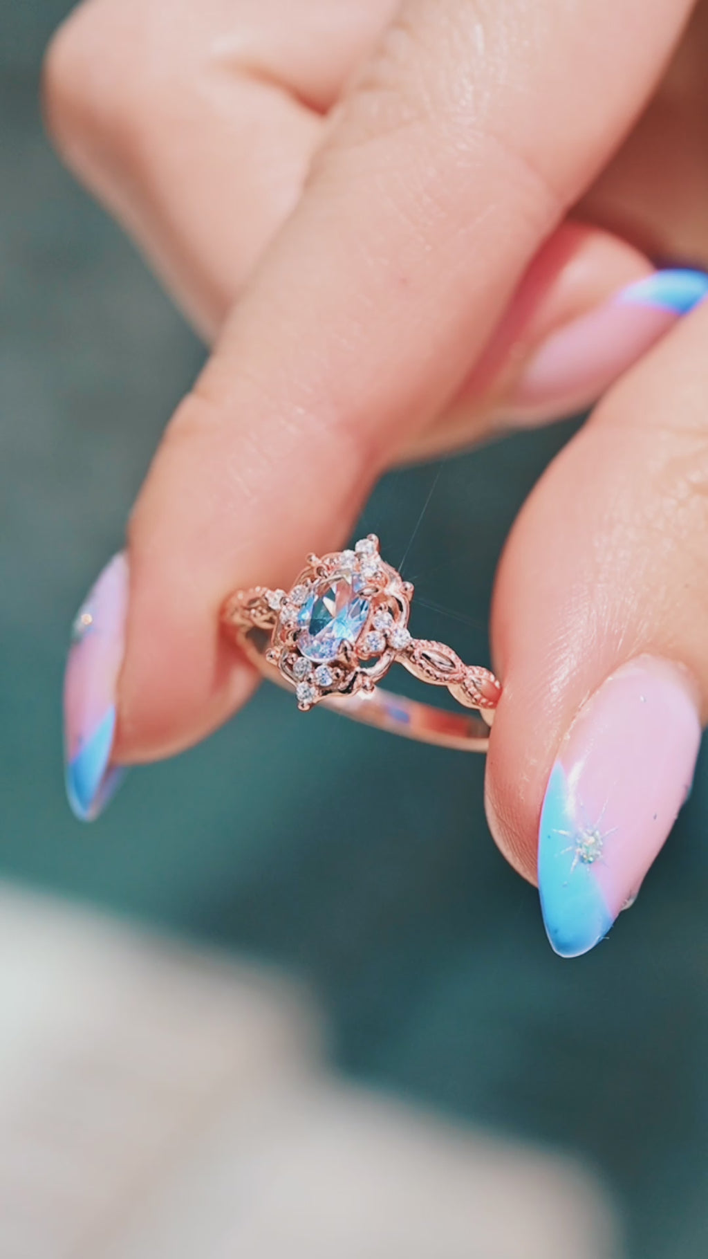 Delicate and serene, the Claire Aquamarine Ring in 14K Solid Rose Gold features a soft blue aquamarine center stone in a vintage-inspired setting. Surrounded by sparkling moissanite accents and graceful antique-style detailing, this ring captures the calm beauty of the sea with a timeless, romantic touch.