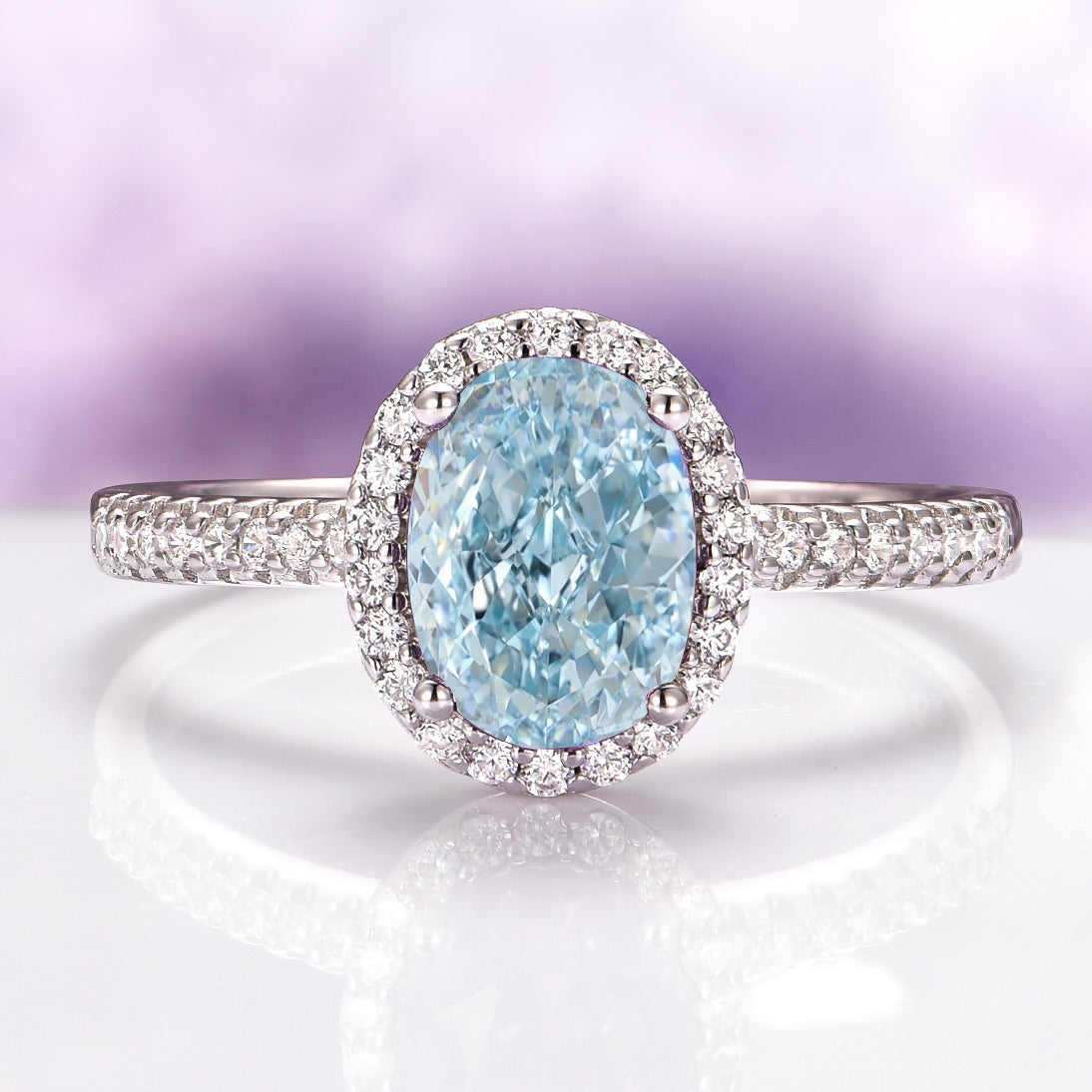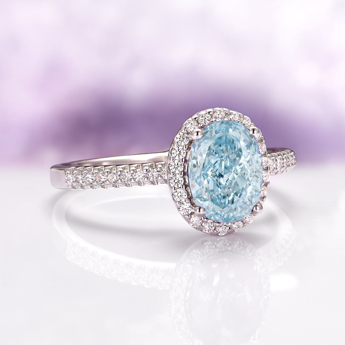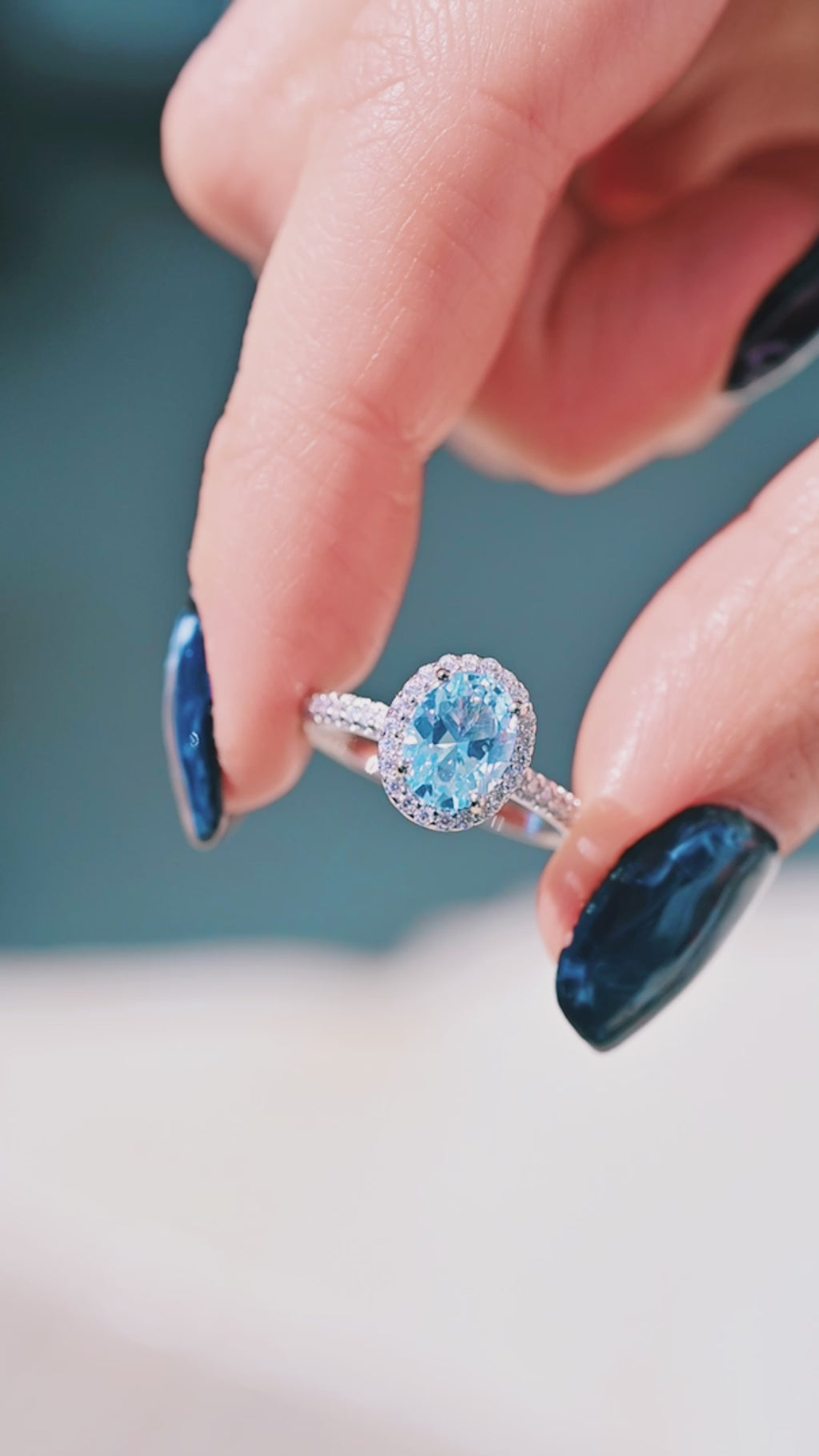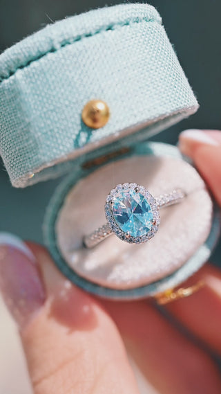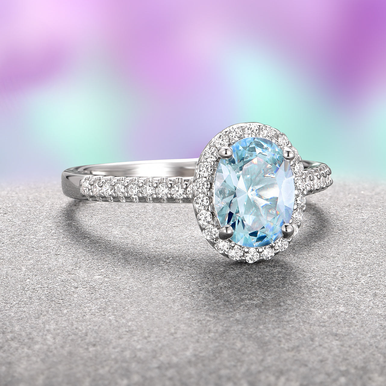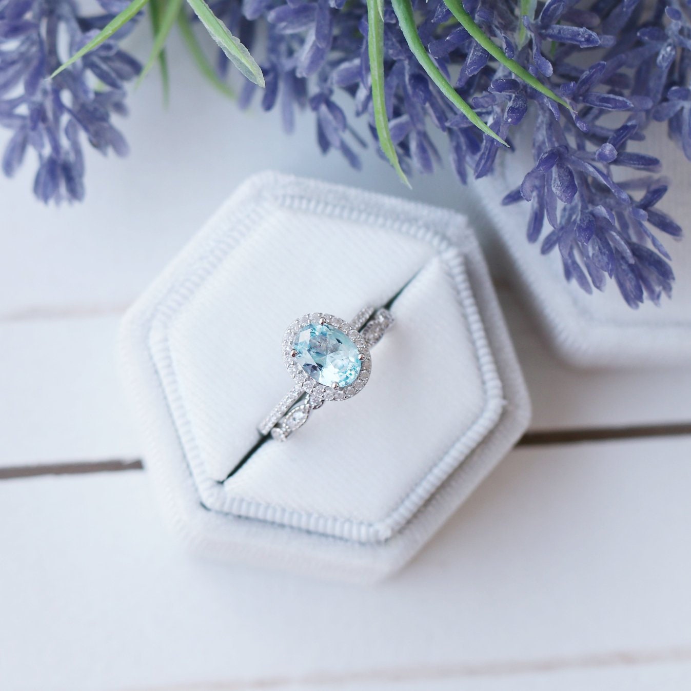 Delicate and radiant, the Iris Aquamarine Ring in 14K Solid White Gold features a serene natural aquamarine center stone in a graceful halo setting, accented by your choice of sparkling moissanite or natural diamonds. This non-traditional engagement ring beautifully blends timeless elegance with a fresh, ocean-inspired touch.