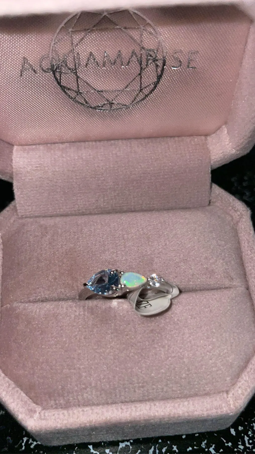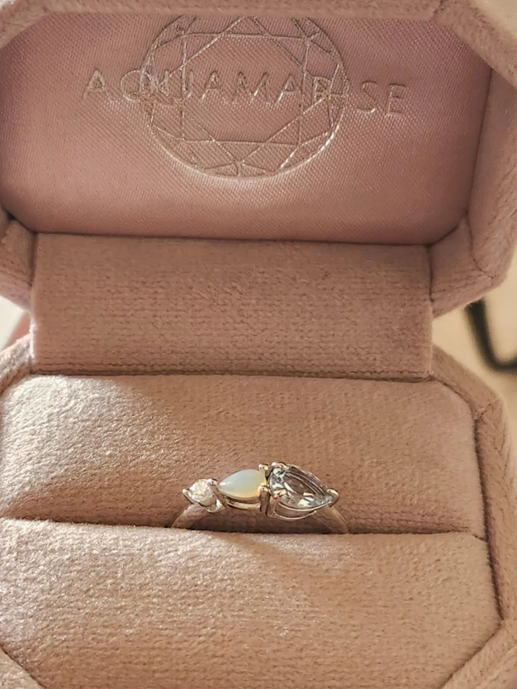 Ring is beautiful as my Mom’s Mother’s Day gift. Both birthstones represent me and my older sister. The Australian opal is beautiful and the aquamarine stone complements the opal beautifully. It was shipped great and came in a ver beautiful light pink ring box. My Mom is going to love it!