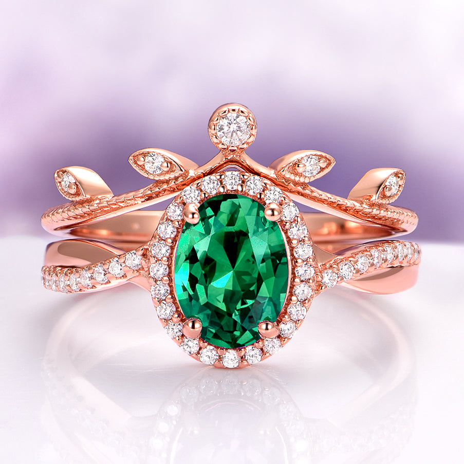 Simulated Diamond & Emerald Leaf Fairy Ring Set in 14K Rose Gold Vermeil