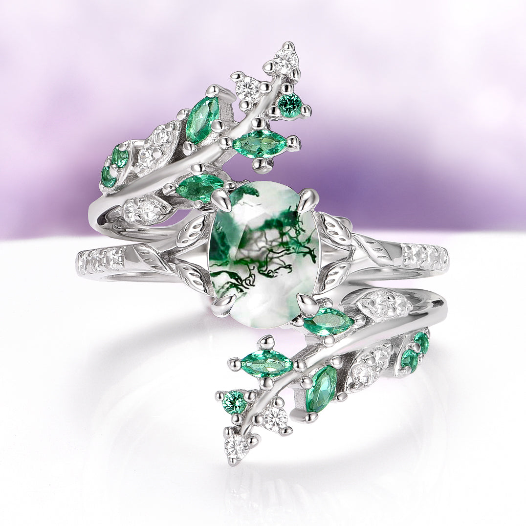Green Moss Agate & Emerald Fairy Leaf Ring Set in Sterling Silver