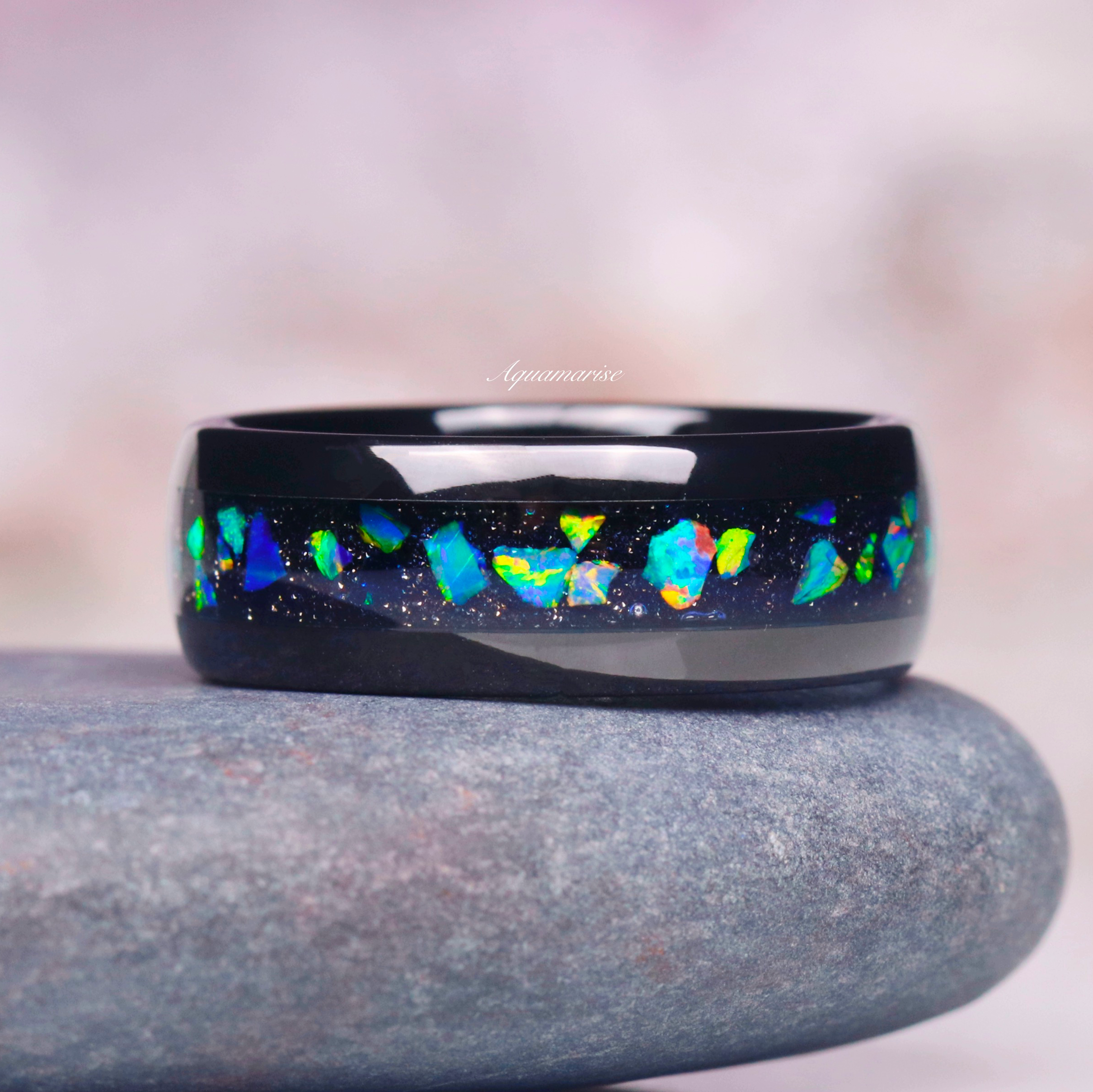 ► Inlaid with crushed emerald green fire opal for a cosmic, glowing effect