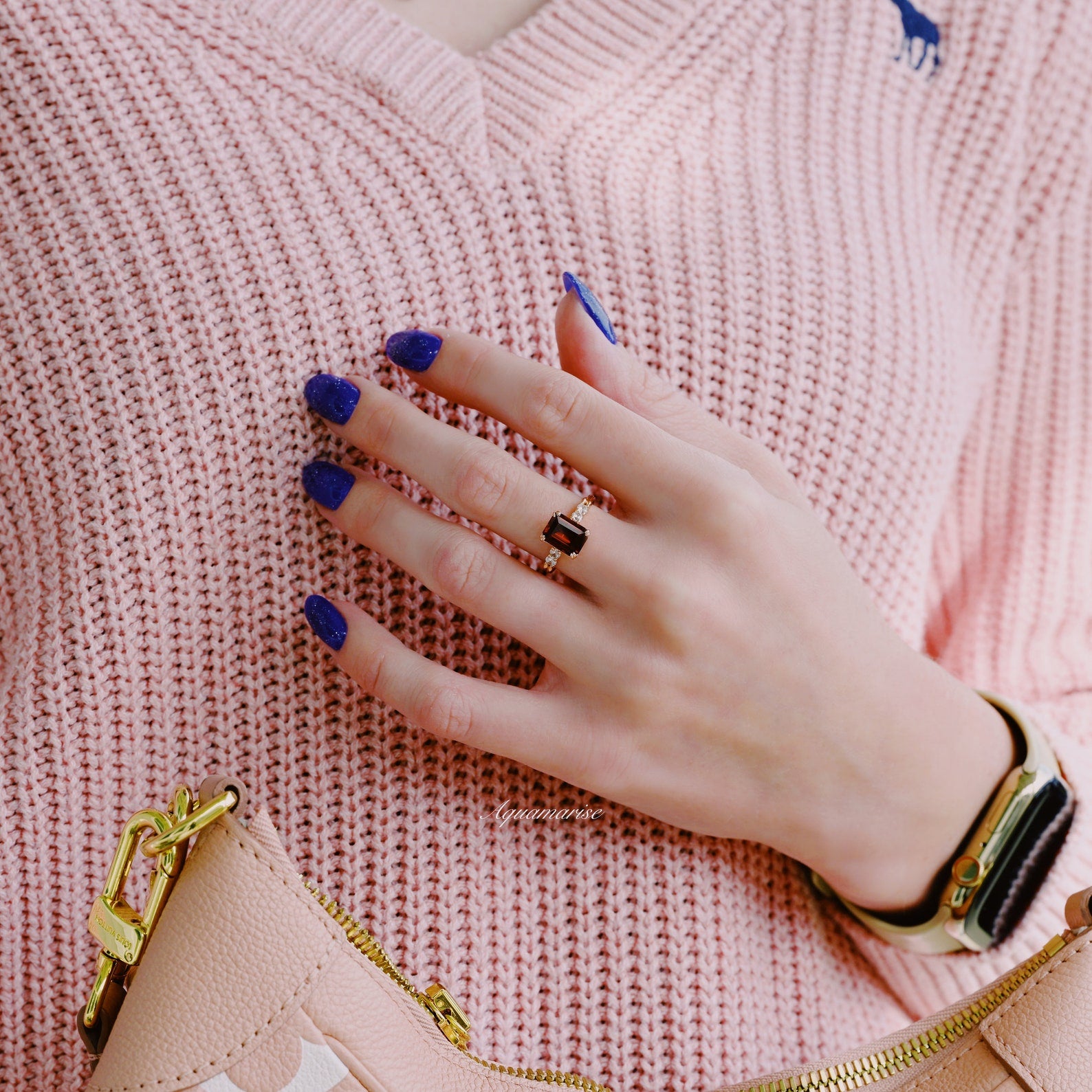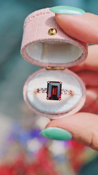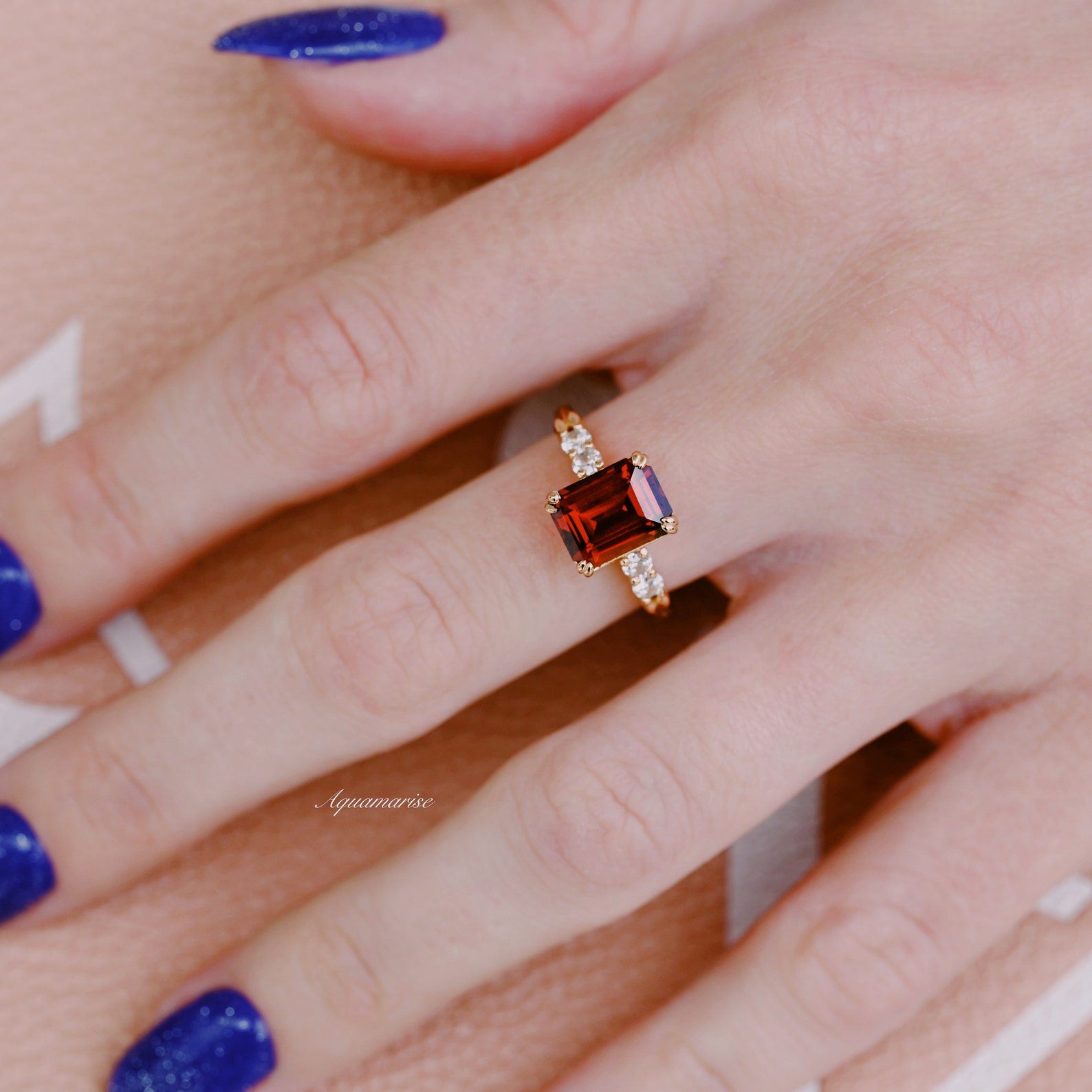 Introducing the Natural Red Garnet Engagement Ring, a timeless design that radiates romance and sophistication. Handcrafted in solid 14K rose gold, this enchanting ring celebrates the enduring beauty of natural red garnet, a gemstone long associated with passion, devotion, and everlasting love. The emerald-cut garnet glows with rich crimson fire, symbolizing warmth and vitality at the heart of your commitment. A delicate hidden halo enhances the brilliance of the center stone, while the slim rose gold band offers a graceful balance of strength and femininity. Elegant and enduring, this engagement ring is a modern heirloom designed to be cherished for a lifetime.