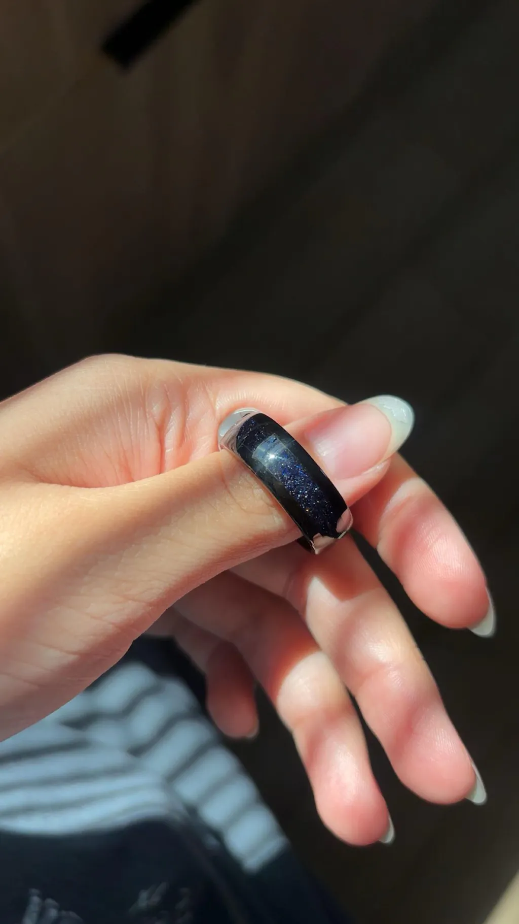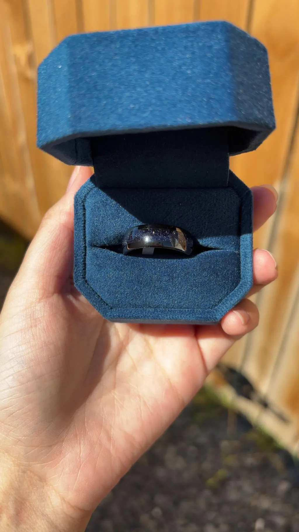The Starry Night Men's Wedding Band is a captivating piece crafted from durable tungsten carbide, designed to symbolize the eternal bond of marriage. Measuring 8mm in width, this unique ring features an enchanting inlay of crushed galaxy sandstone, evoking the mesmerizing beauty of a starlit sky. The intricate interplay of dark and shimmering particles within the band captures the essence of outer space, making it a perfect choice for those who are inspired by the cosmos. This wedding band blends strength with cosmic elegance, offering a timeless piece that stands out with its celestial charm.