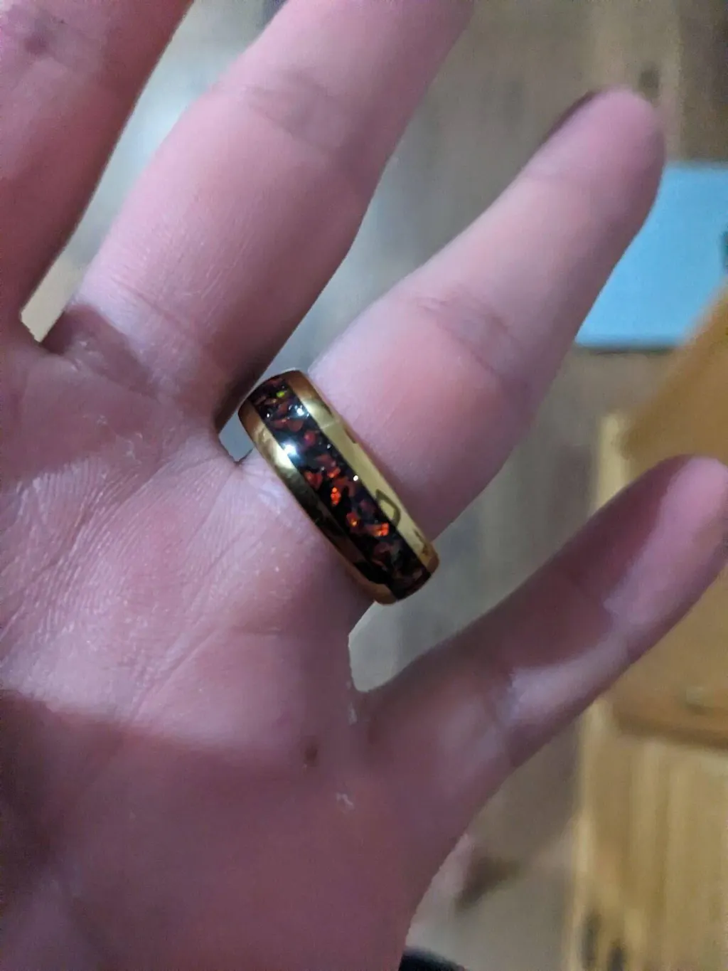►Material: Yellow Gold Tungsten Carbide, Crushed Red Fire Opal, and Sandstone
