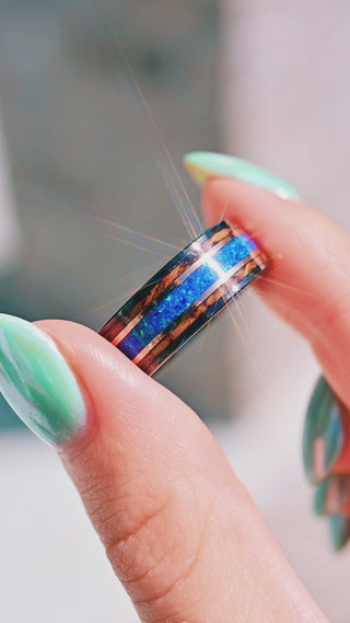 Whiskey Barrel and Blue Fire Opal Wedding Band in Tungsten (8mm)