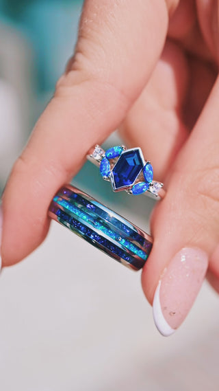 Introducing the Blue Fire Opal, Meteorite & Sapphire Men's Wedding Band – a mesmerizing fusion of celestial elegance and rugged sophistication. Crafted for the modern man who appreciates the wonders of the universe, this outer space-inspired ring embodies a timeless connection to the cosmos.