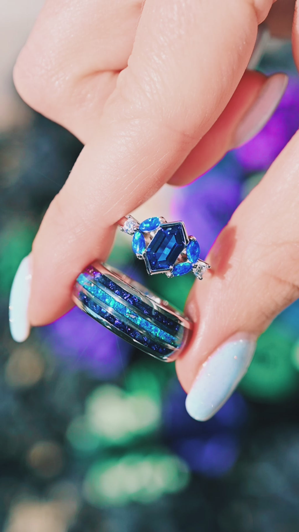 ►Material: Polished Tungsten Carbide, Blue Fire Opal, Sapphire, and Meteorite.