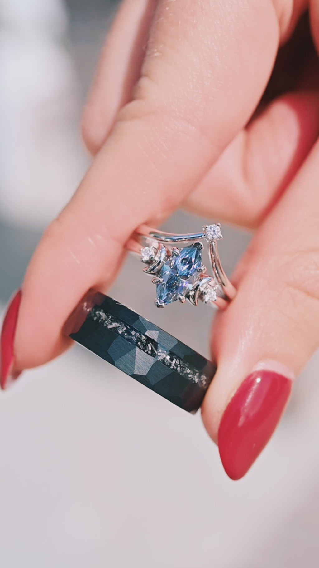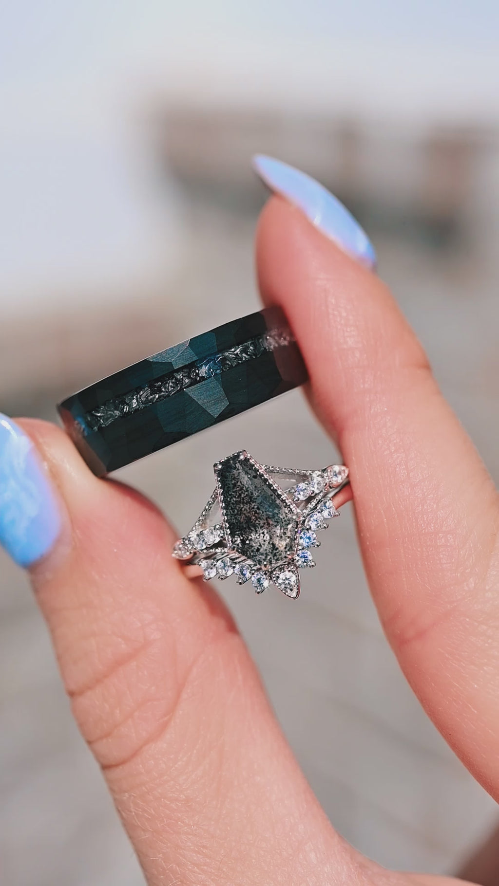 ►Material: Hammered and Brushed Black Tungsten Carbide and Crushed Meteorite Inlay