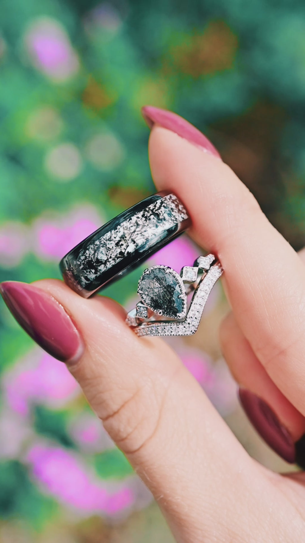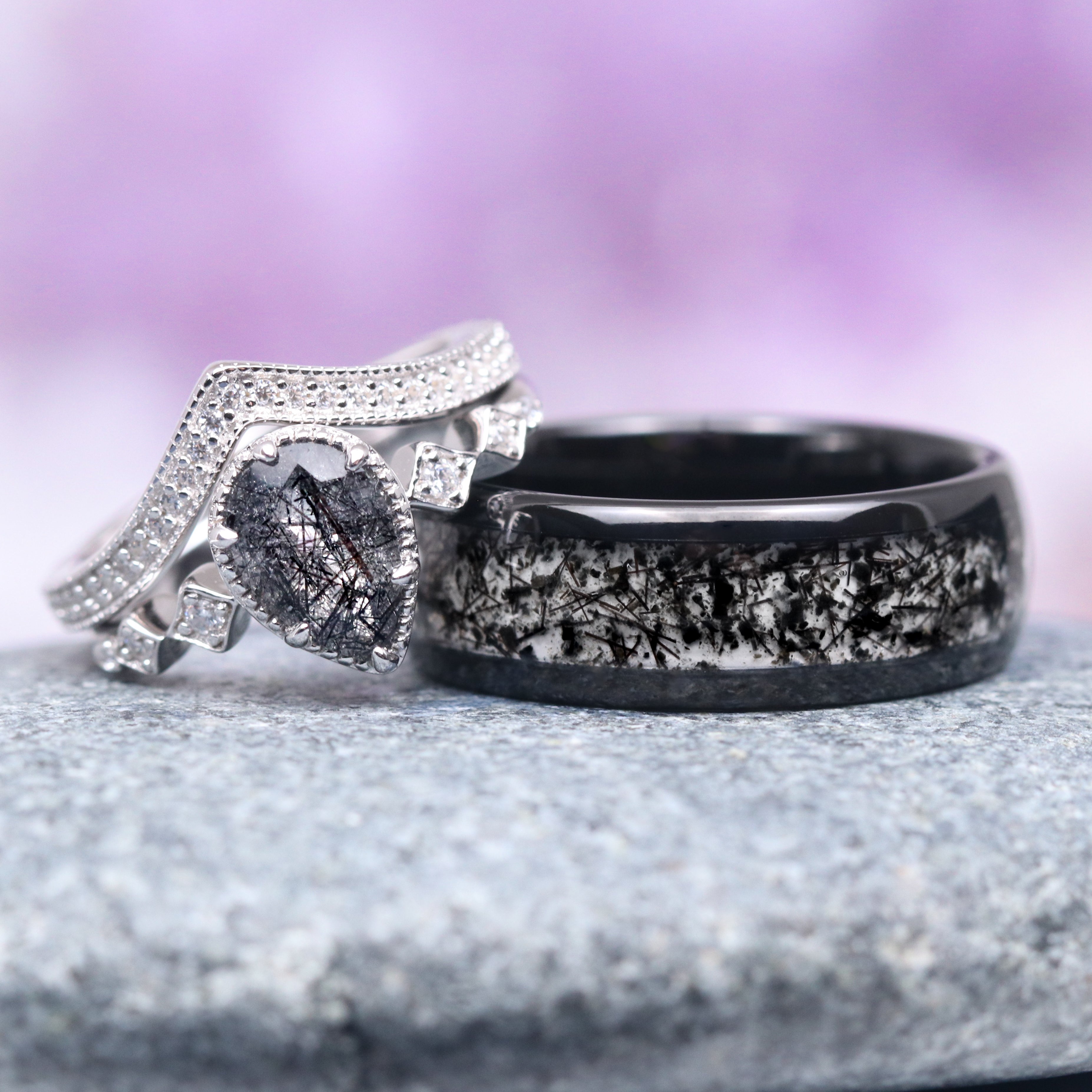 ►With its unique blend of rugged black tungsten and natural quartz detail, this ring is ideal for those who seek both style and substance in their wedding jewelry.
