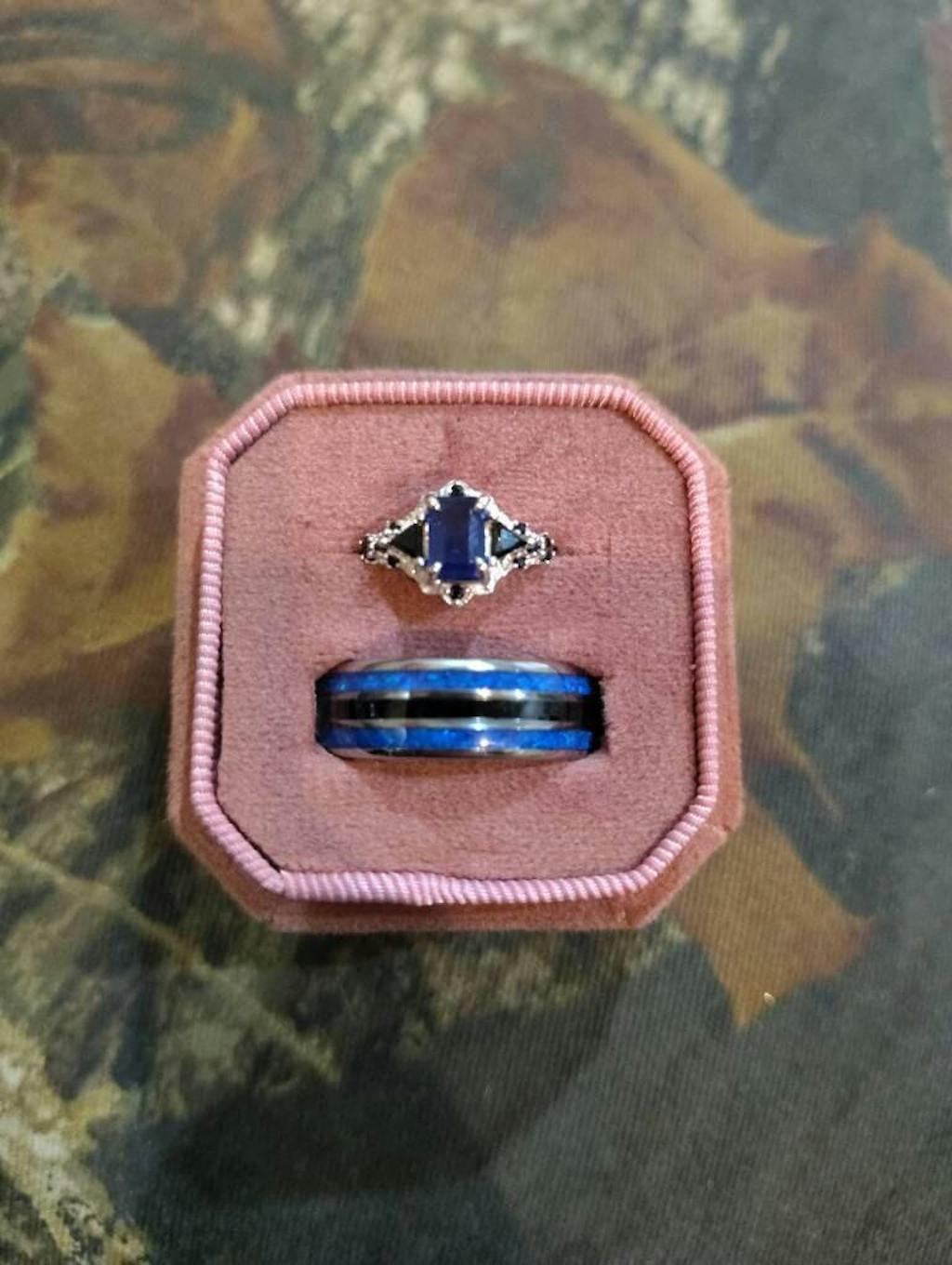 ►His ring is Tungsten Carbide with Crushed Blue Fire Opal & Black Onyx Inlay.