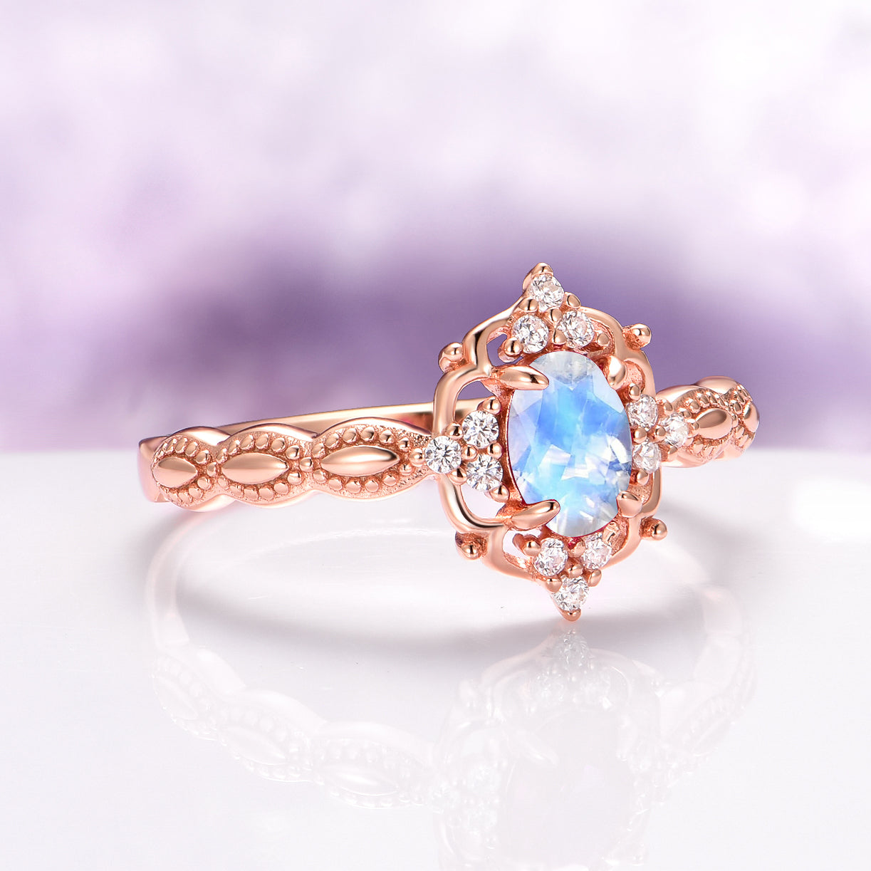 Ethereal and feminine, the Claire Moonstone Ring in 14K Solid Rose Gold features a glowing natural moonstone in a smooth cabochon cut, set in a vintage-inspired design. Accented with sparkling moissanite side stones and intricate rose gold detailing, this ring captures the soft magic of a fairytale romance.