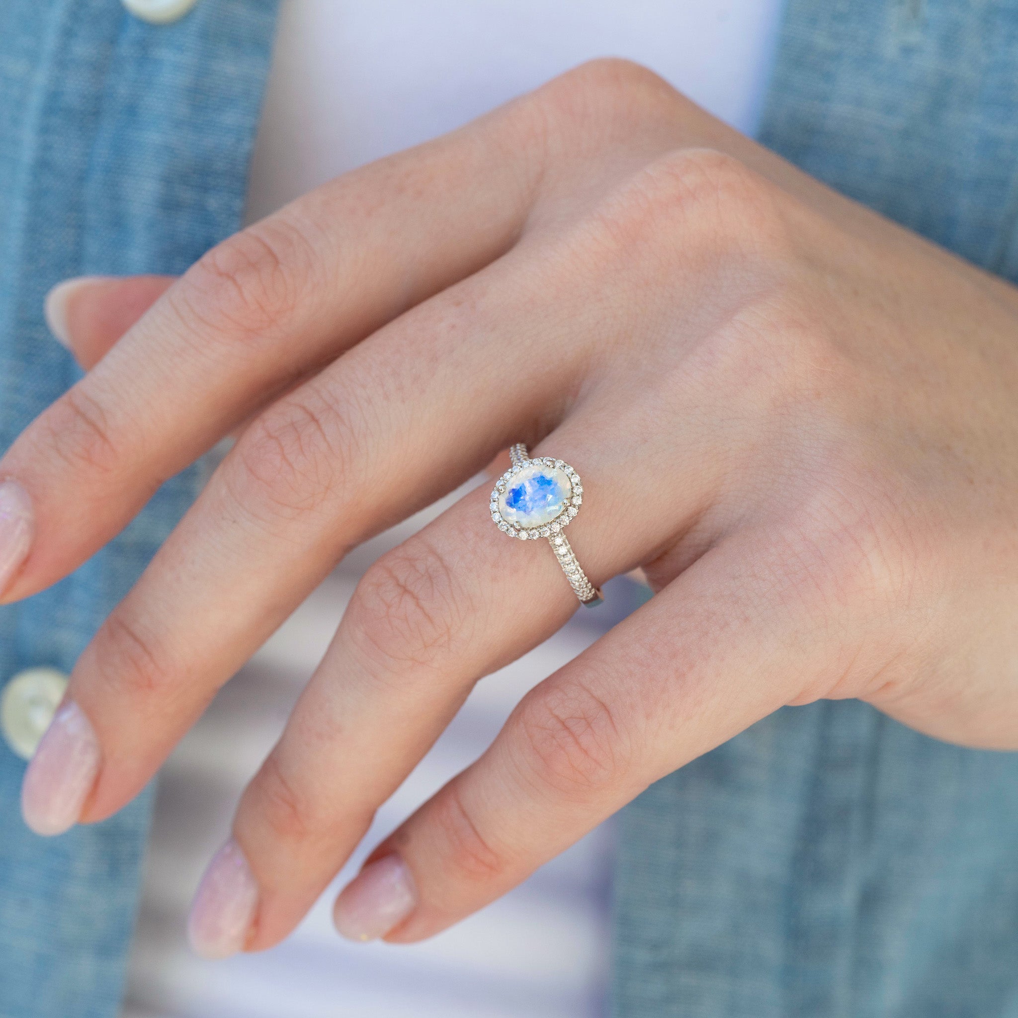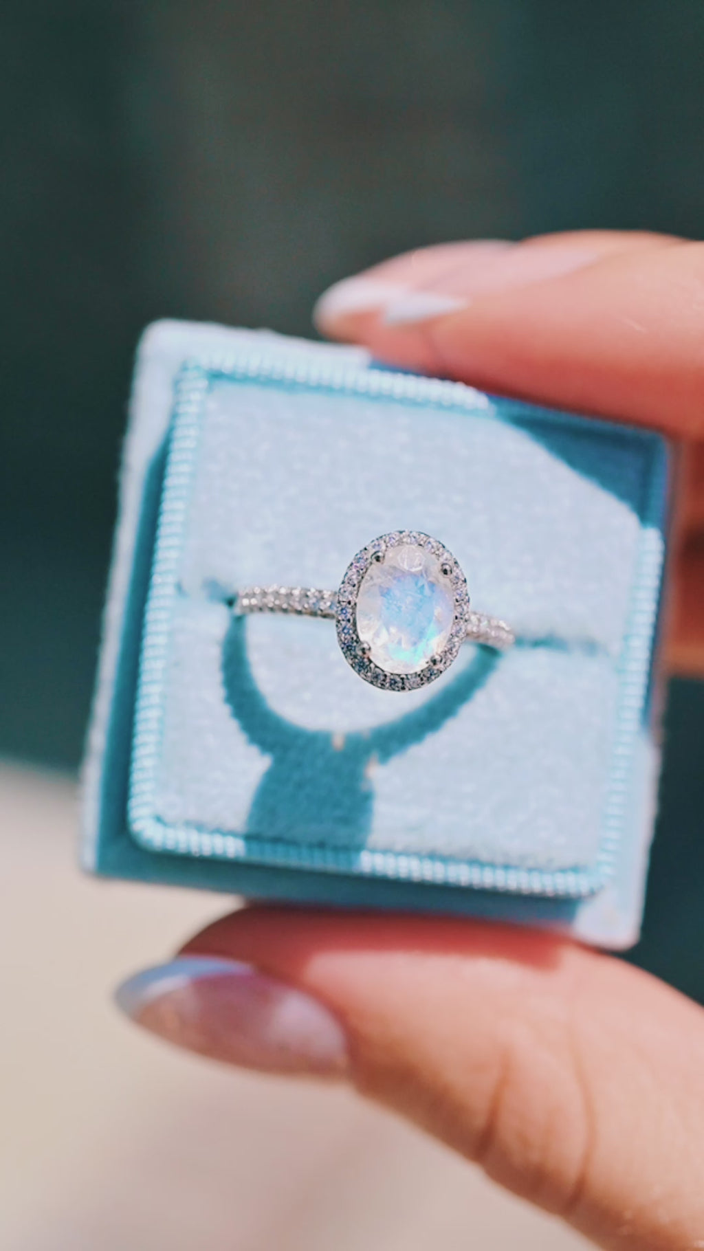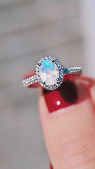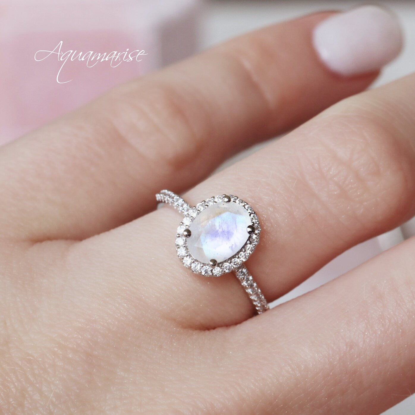 ►The Natural Rainbow Moonstone, with its play of colors, creates a mesmerizing dance of hues that shift with the light. Its soft, milky surface is adorned with subtle flashes of blues, pinks, and purples, making each ring truly unique. This gemstone is believed to bring harmony, inner peace, and emotional balance, making it an ideal choice for an engagement ring.
