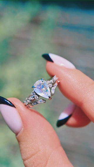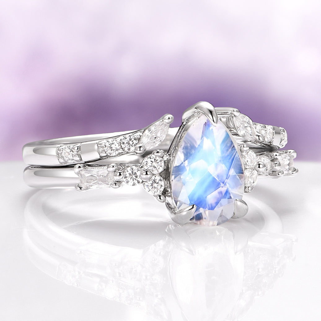 Dreamy and delicate, this Teardrop Natural Moonstone Ring Set in 14K White Gold is a luminous choice for those drawn to celestial beauty and ethereal elegance. Featuring a glowing teardrop-cut natural moonstone and your choice of moissanite or natural diamond accents, this enchanting set is full of soft shimmer and mystical charm.
