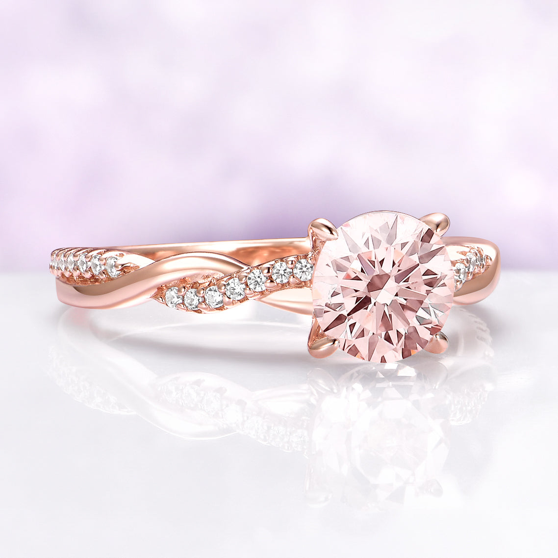 At the center is a luminous 7mm round lab-created morganite, chosen for its delicate peachy-pink hue and radiant brilliance. The stone is set in a warm 14K rose gold vermeil band, where a graceful twisted vine design wraps around the finger — symbolizing unity, growth, and everlasting love.