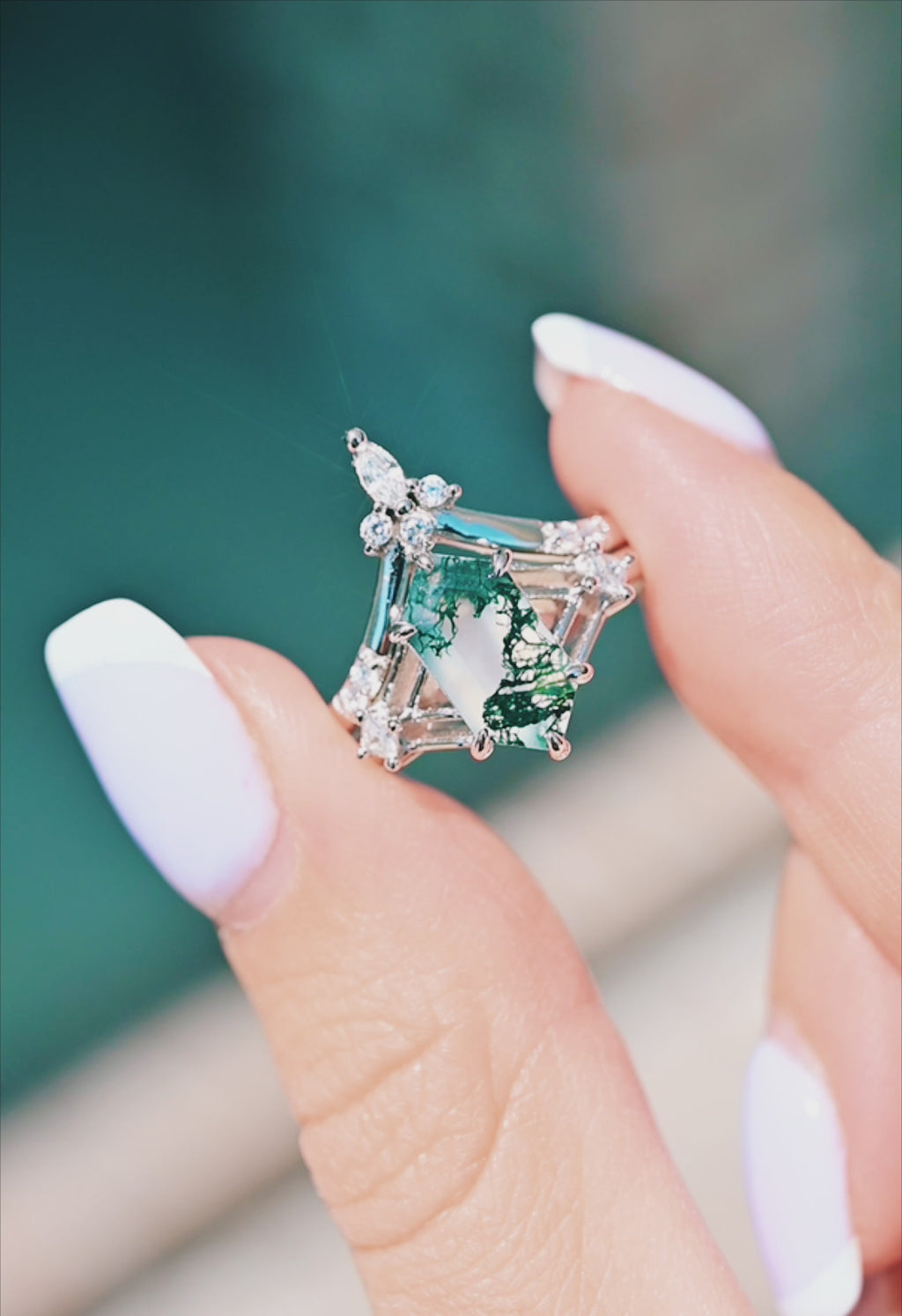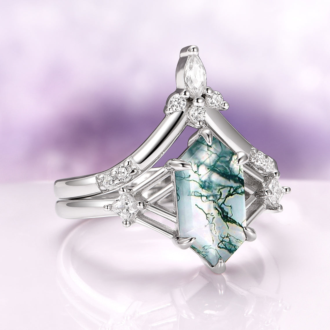 Celtic Hexagon Cut Green Moss Agate Ring Set in Sterling Silver