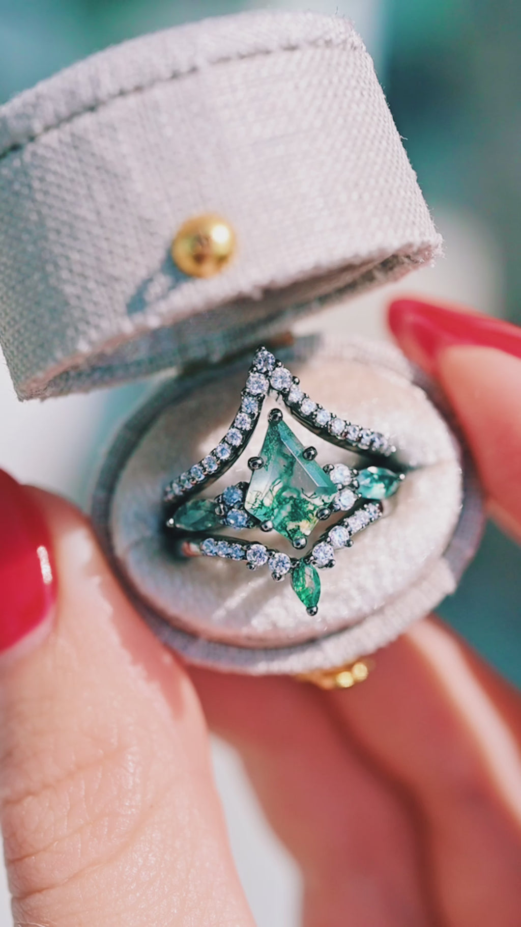 Handcrafted with care, the centerpiece features a striking kite-cut natural moss agate, celebrated for its earthy green inclusions that resemble tiny landscapes captured in stone. Paired with sparkling accent stones and a dramatic black ruthenium finish, this ring set redefines what an engagement ring can be — captivating, mysterious, and completely unforgettable.