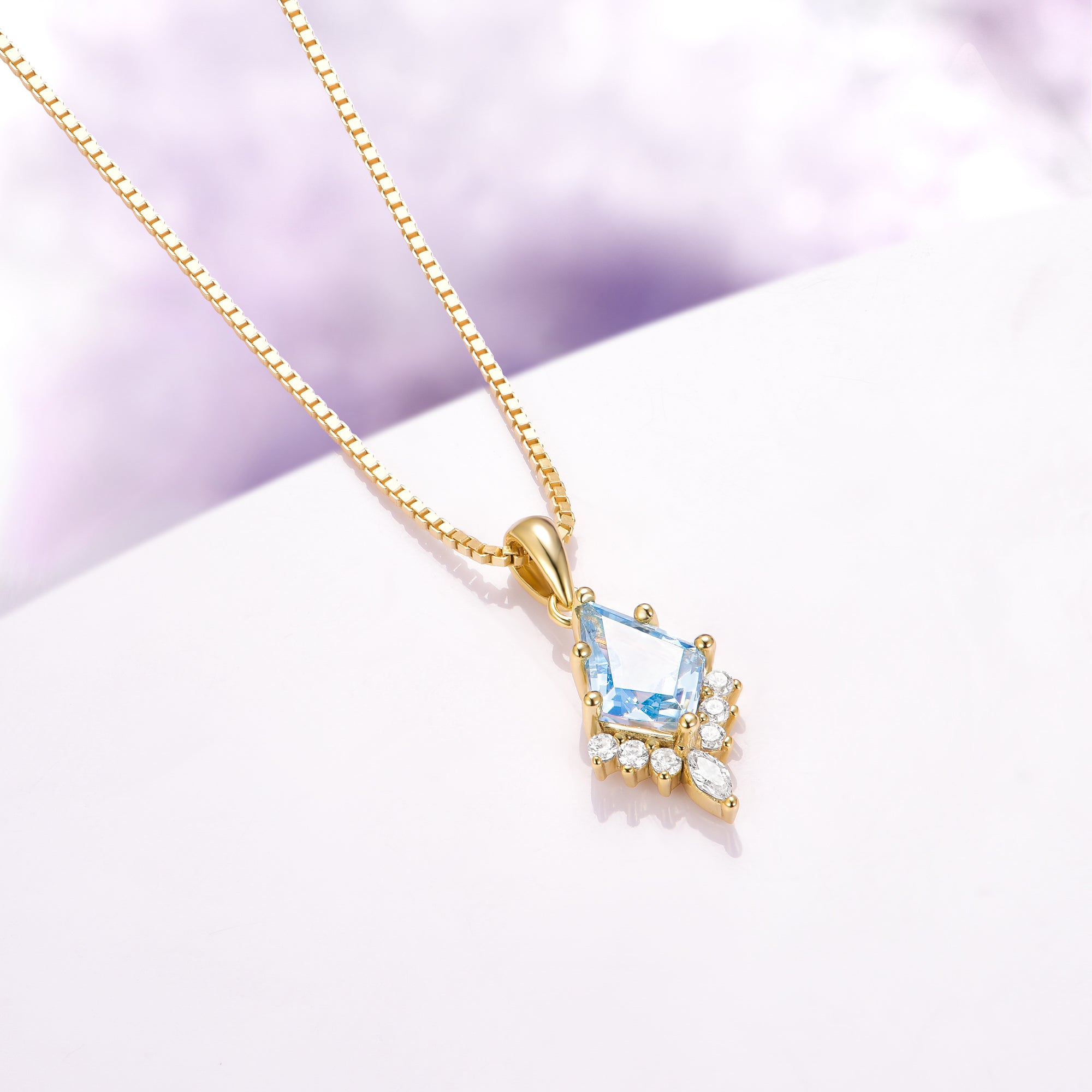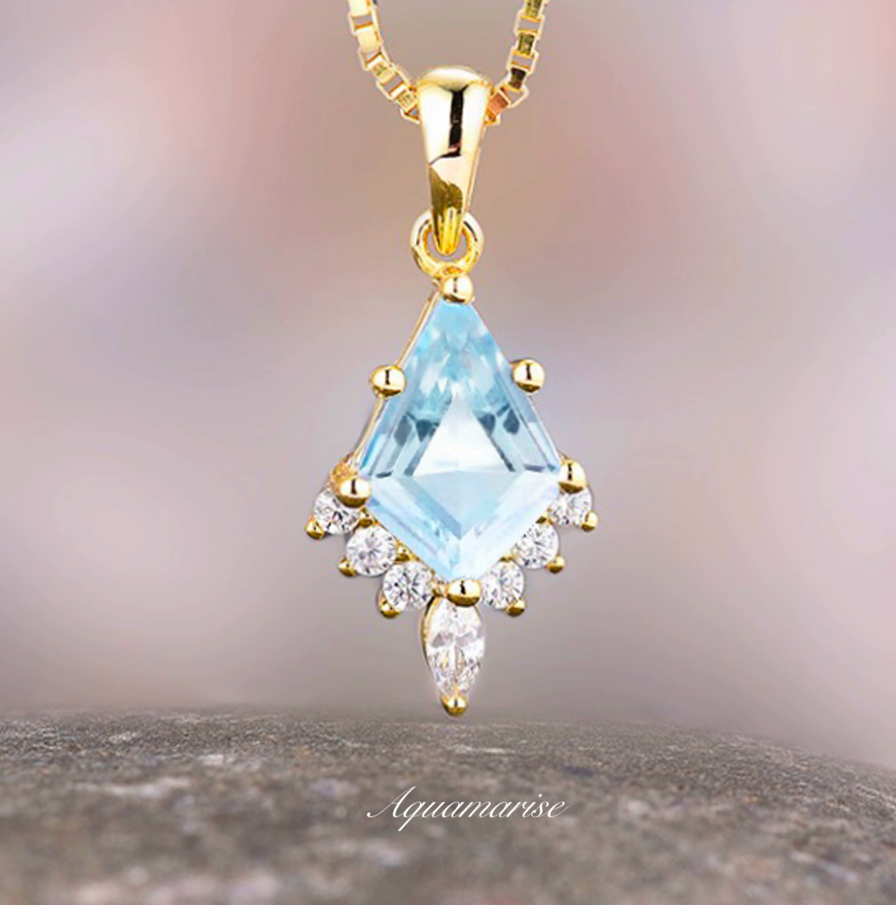 A gorgeous minimalist 14k yellow gold vermeil kite cut aquamarine necklace sounds like a stunning and thoughtful gift. Aquamarine is a beautiful gemstone known for its calming blue color, and the kite cut adds a unique and modern touch to the design. The 14k yellow gold vermeil adds a luxurious and elegant feel to the necklace.