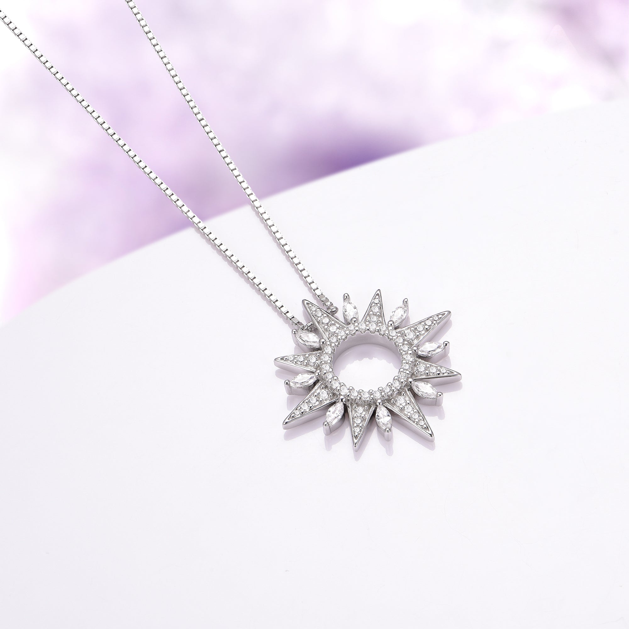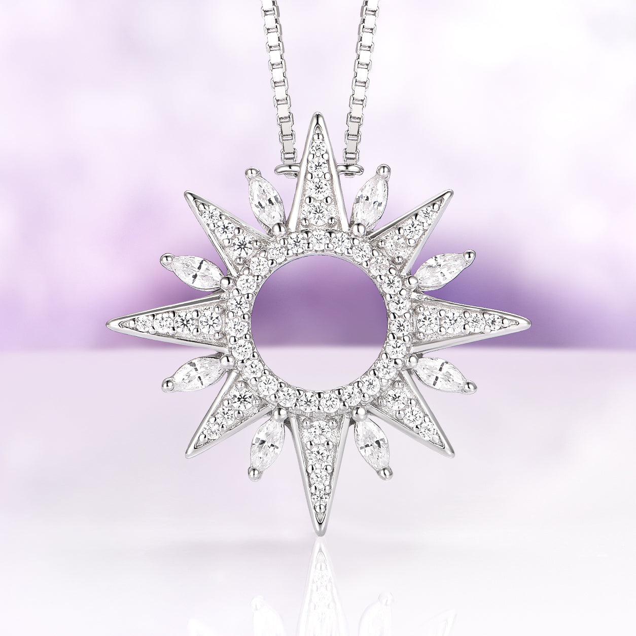 Elevate your everyday look with this dazzling Starburst Diamond Necklace, crafted in solid 925 sterling silver. Inspired by the brilliance of the North Star, this dainty pendant features a sparkling 1.3 ct. cubic zirconia center stone that adds just the right touch of shimmer. Whether worn solo or layered with your favorite chains, it’s a timeless piece that complements every style.