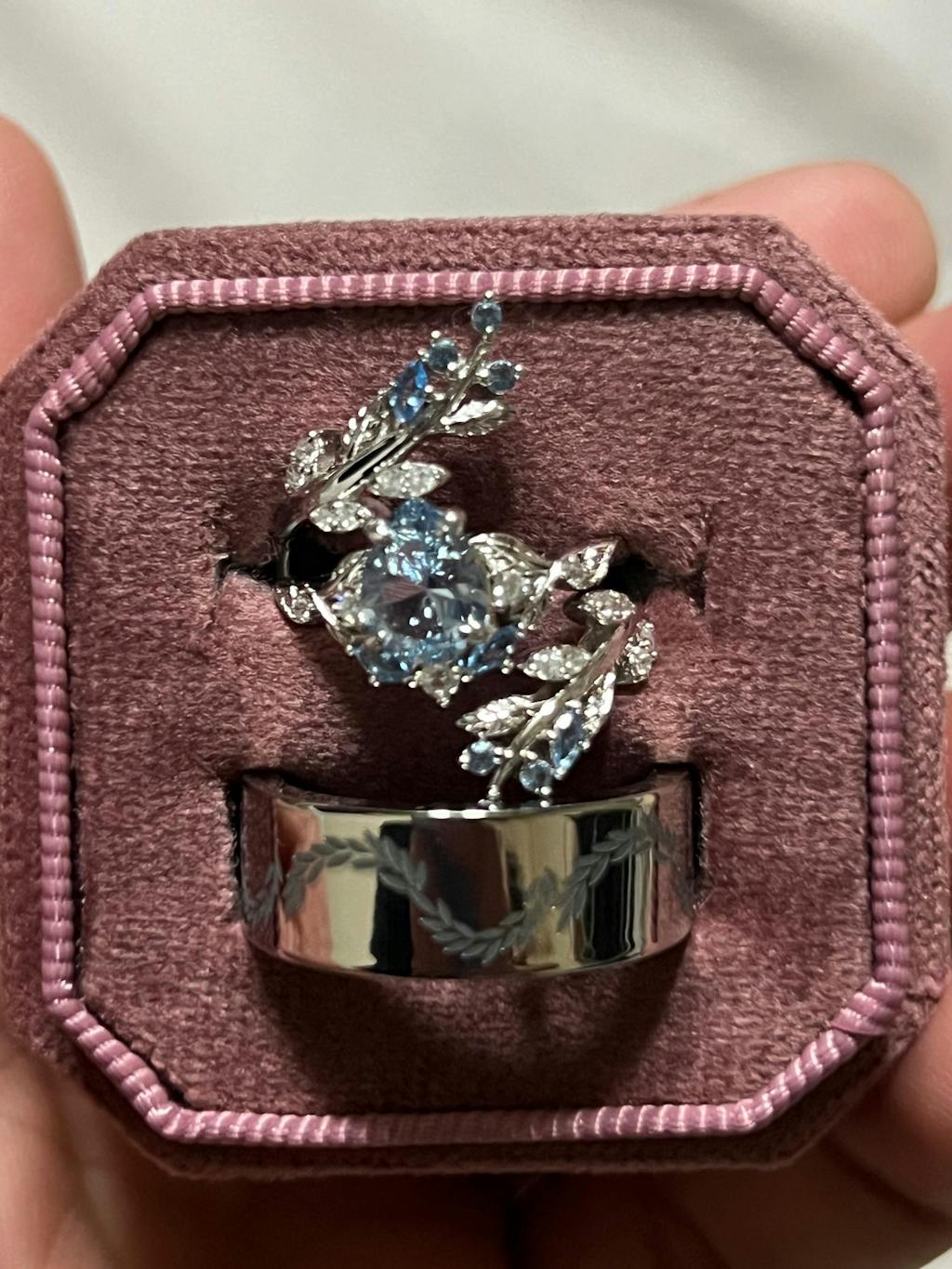 ►Her Ring: Delicate and refined, her ring is made from 925 sterling silver, radiating a subtle elegance. The intricate leaf pattern cradles a stunning aquamarine gemstone, symbolizing tranquility and clarity.