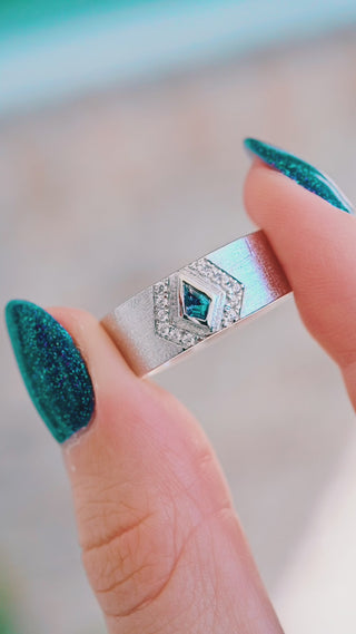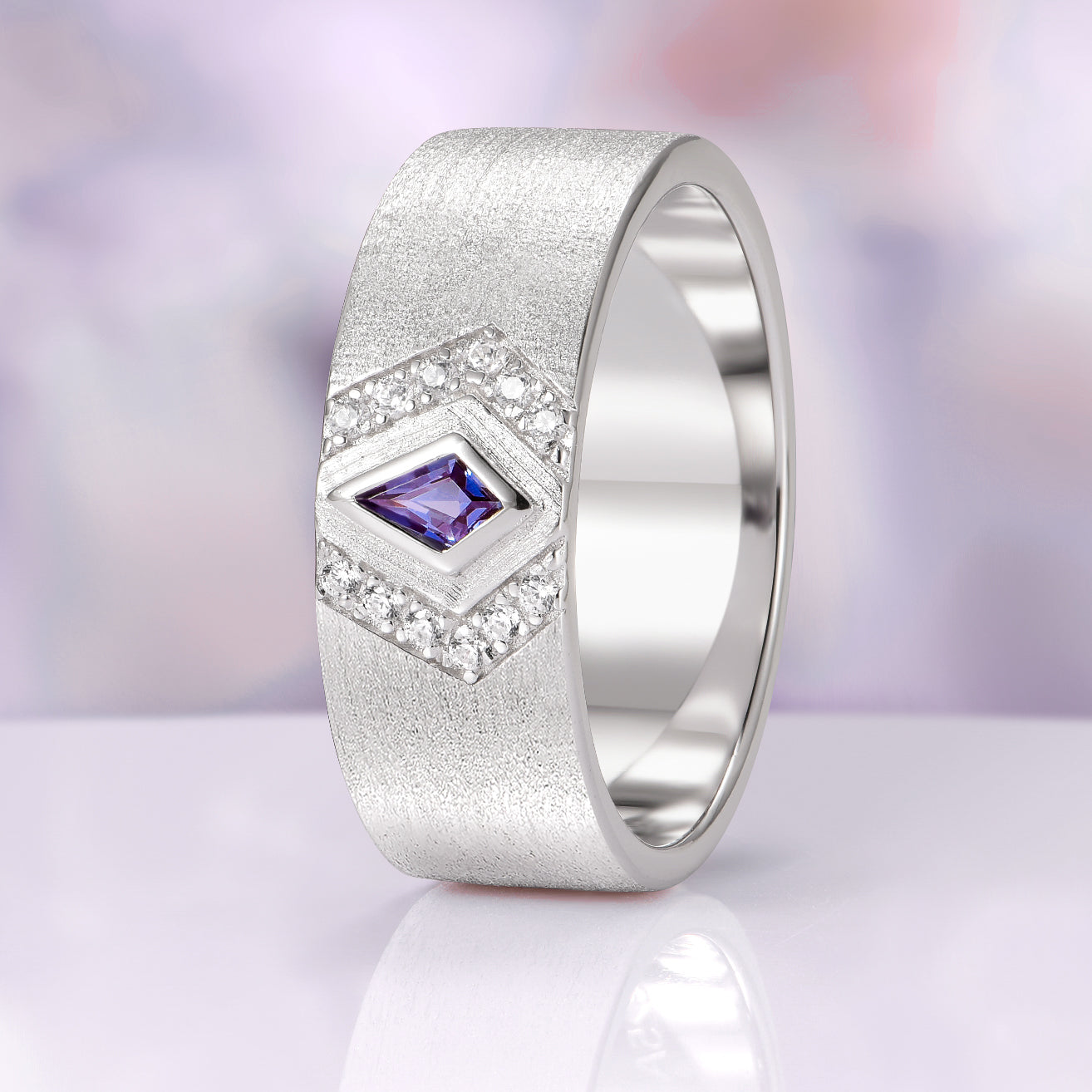 ► His Ring: 8mm comfort-fit band crafted from 925 solid sterling silver with a rhodium finish, featuring a matching lab-grown alexandrite in a geometric frame with pavé-set accents.